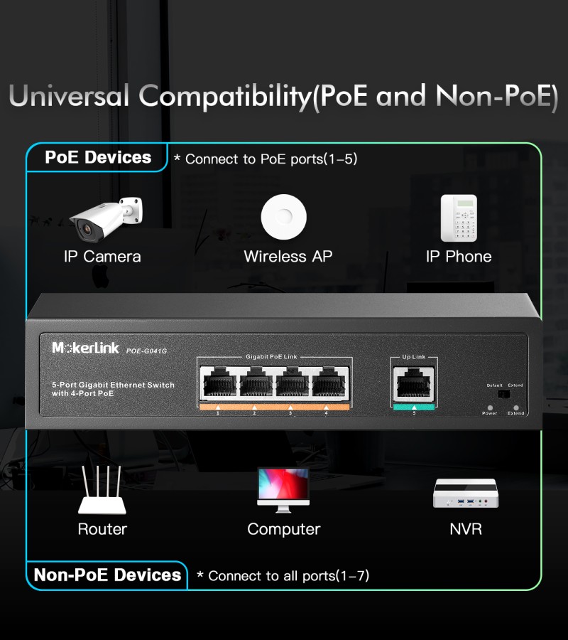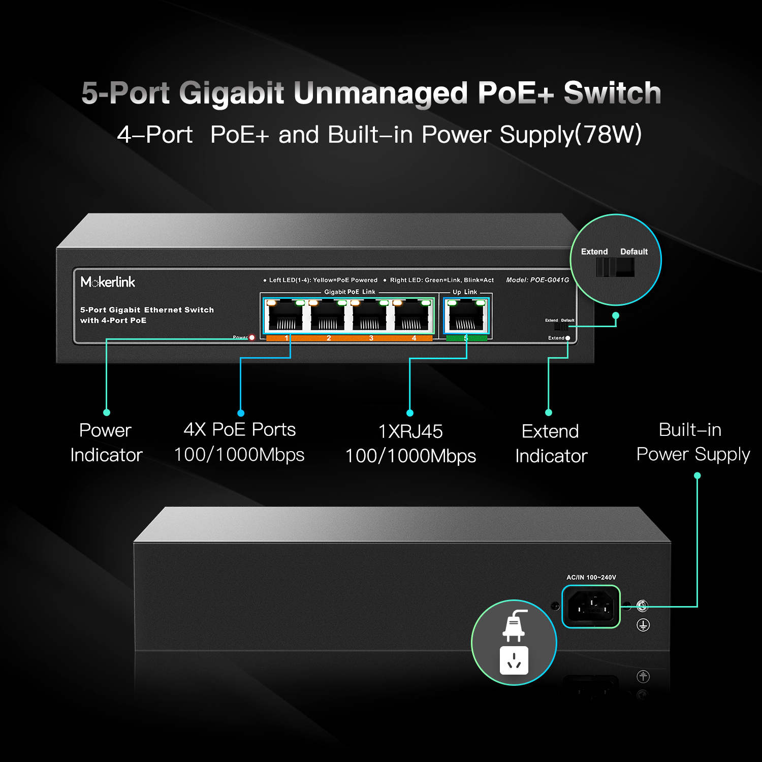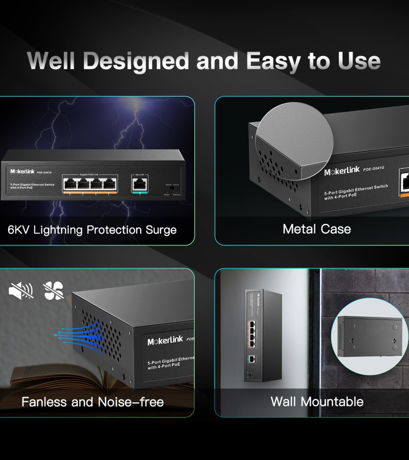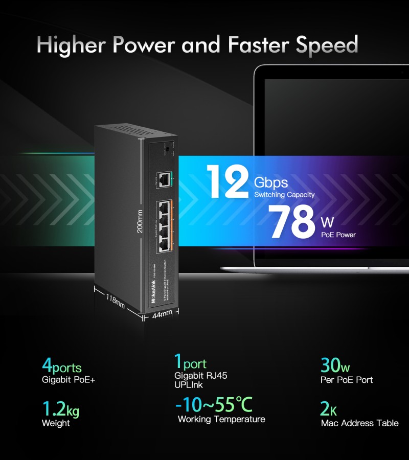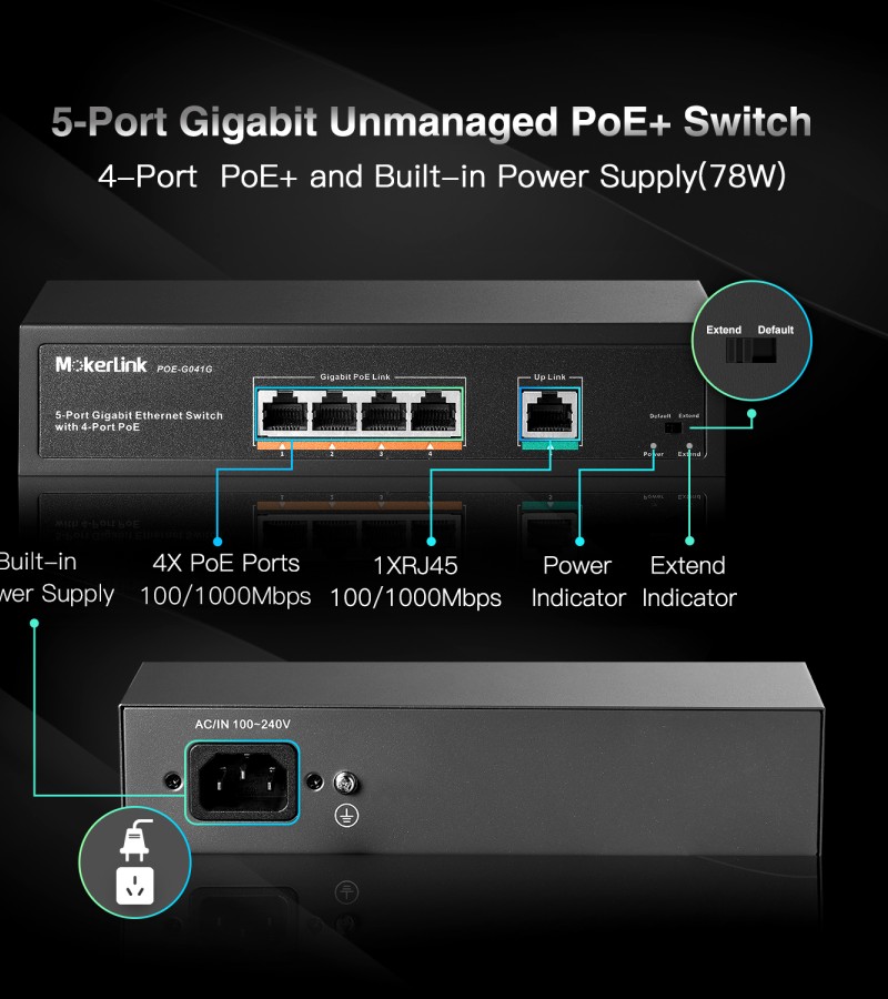 Cuatro puertos de Gigabit poe, un puerto de enlace ascendente de Gigabit (no poe), soporte máximo de presupuesto de 78w poe, soporte IEEE 802.3 AF / at, potencia máxima de alimentación de 30w por puerto. Diseño sin gestión, plug - and - play, sin ventilador, adecuado para una variedad de entornos de instalación