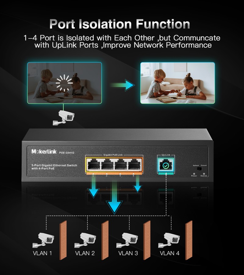 | DIP Switch | Extend: Port isolation mode. In this mode, the PoE ports (1-4) of the switch cannot communicate with each other, and can only communicate with the UP-link port. Default: Normal mode, all port can communicate with each other |
