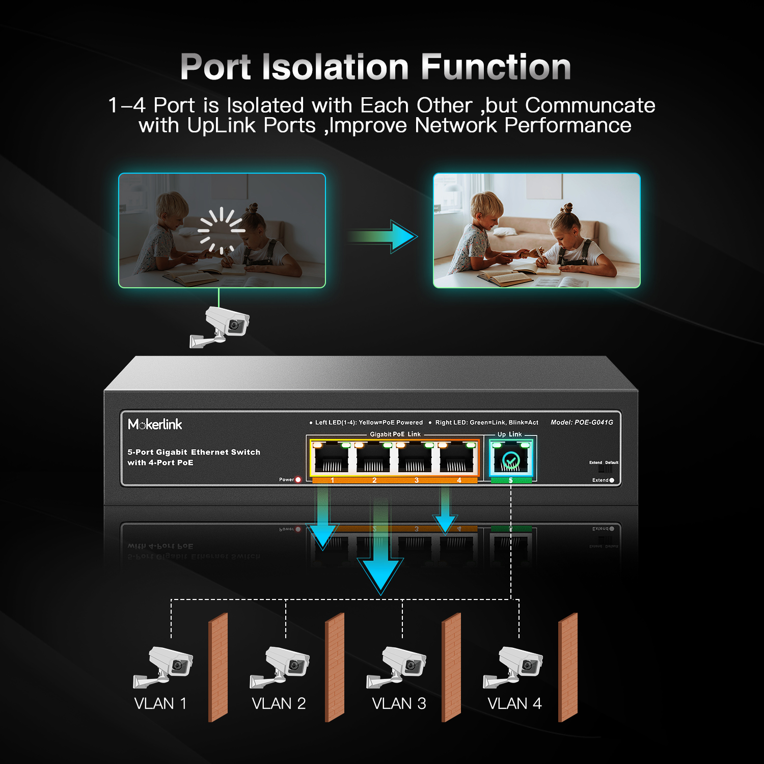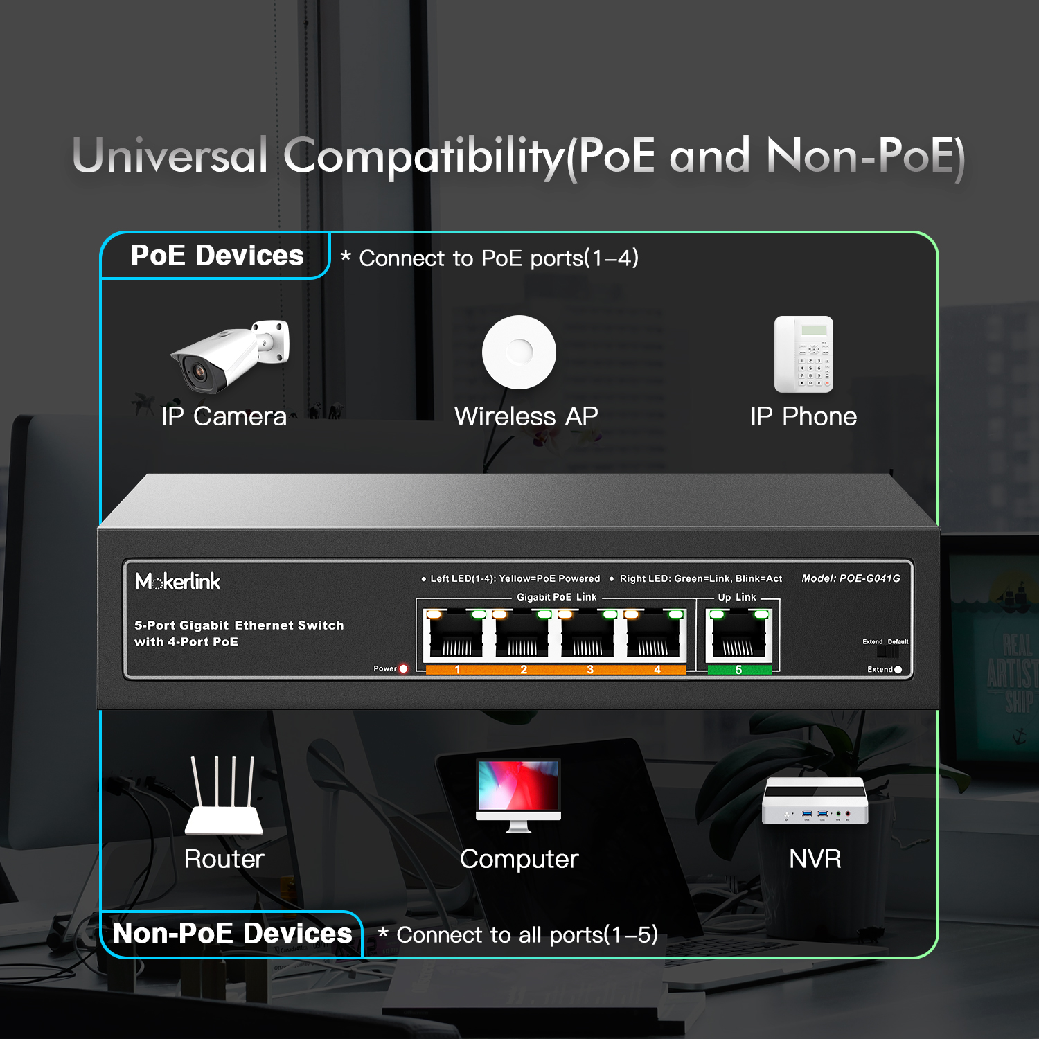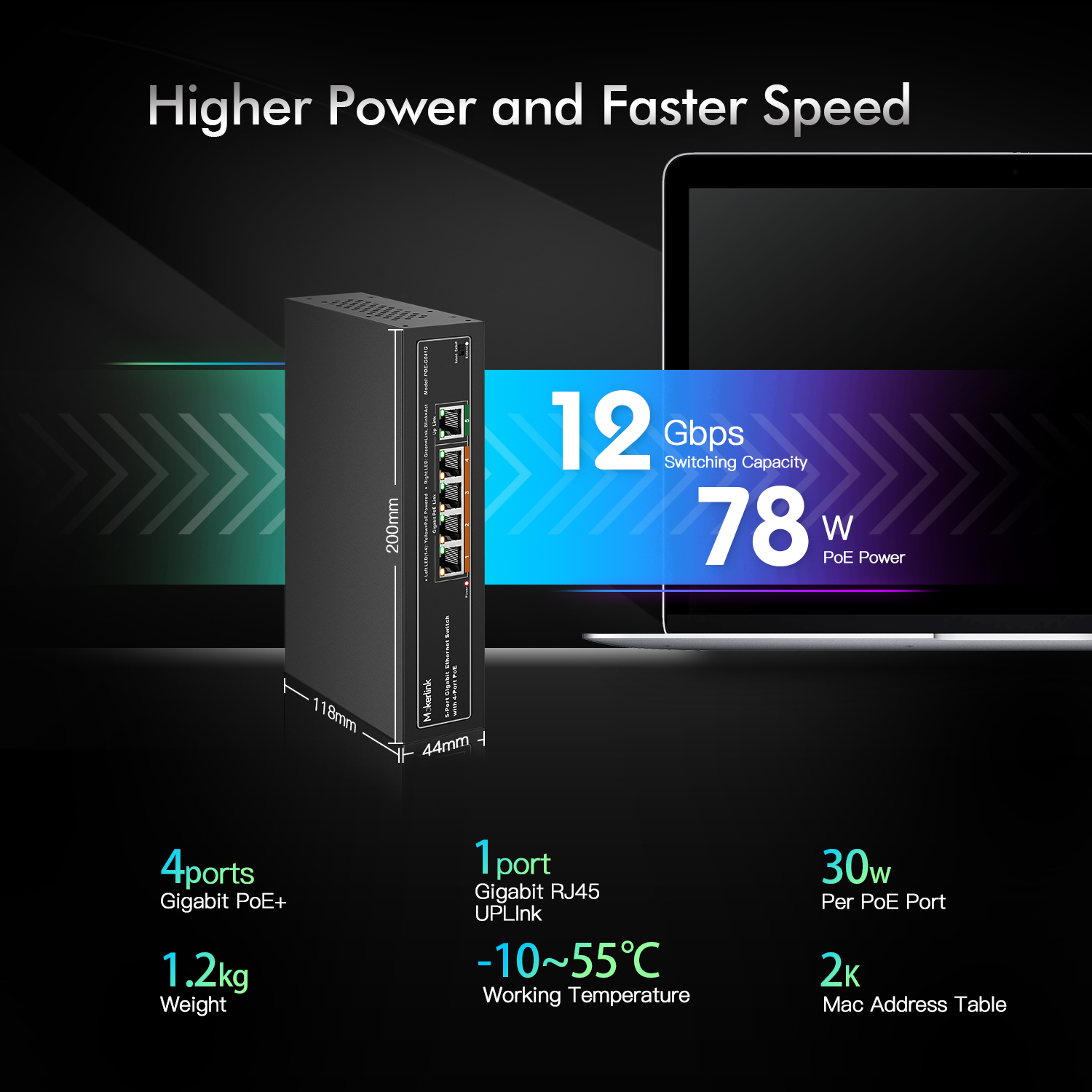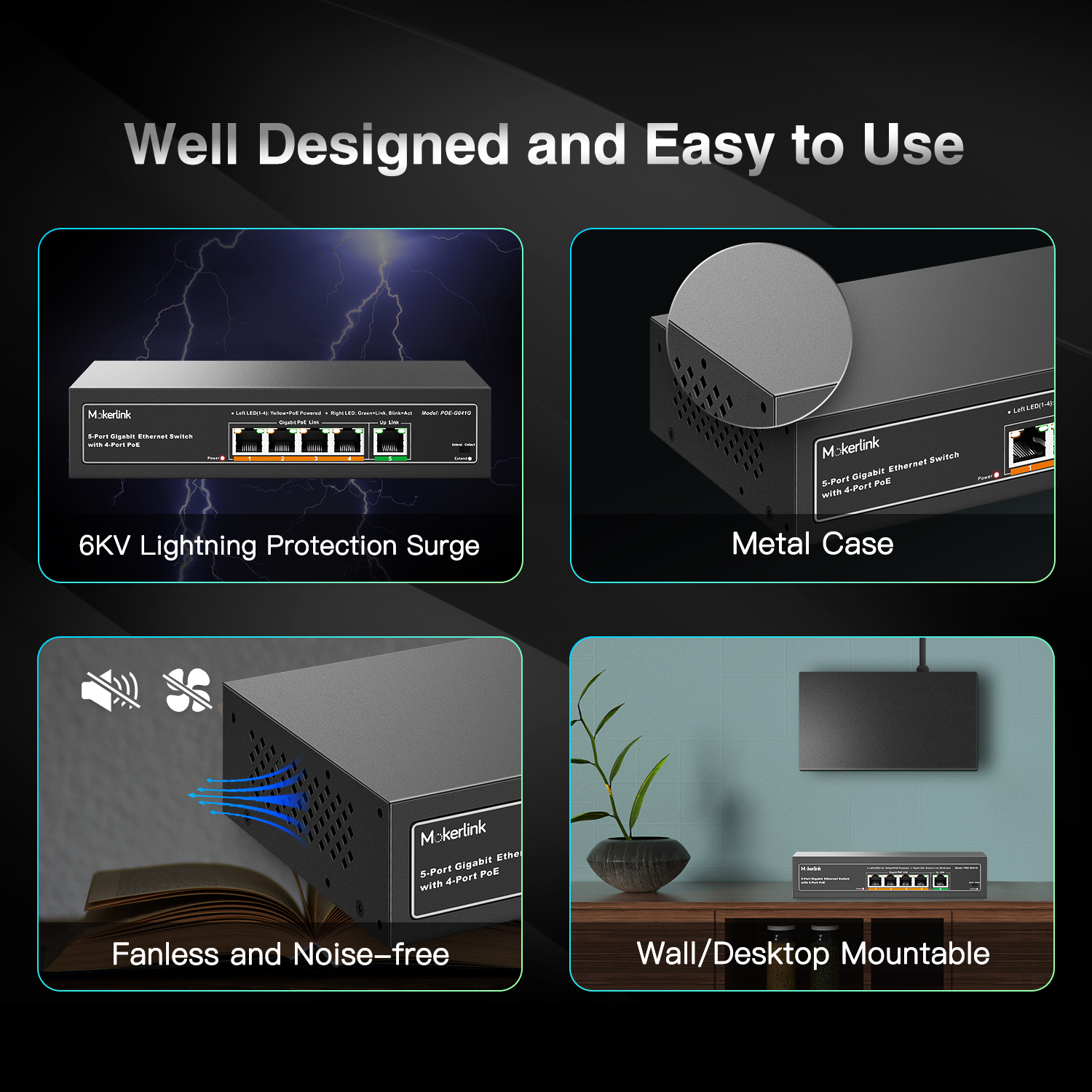 Mokerlink 5 Port Gigabit Poe switch, con 4 Poe + Port 1000mbps, 78w ieee802.3af / at, sin gestión plug - and - play, metal sólido sin ventilador