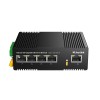 4x1G ethernet ports and 1x1G uplink, all ports support 10/100/1000Mbps rate, switching capacity up to 14Gbps, The shell is made of industrial-grade aluminum alloy, integrated DIN-rail mount kit, IP40 protection grade, working temperature -40~75°C(-40~185°F), Dual power supply input support, equipped with one UL-certified power adapter, plug and play, no configuration needed