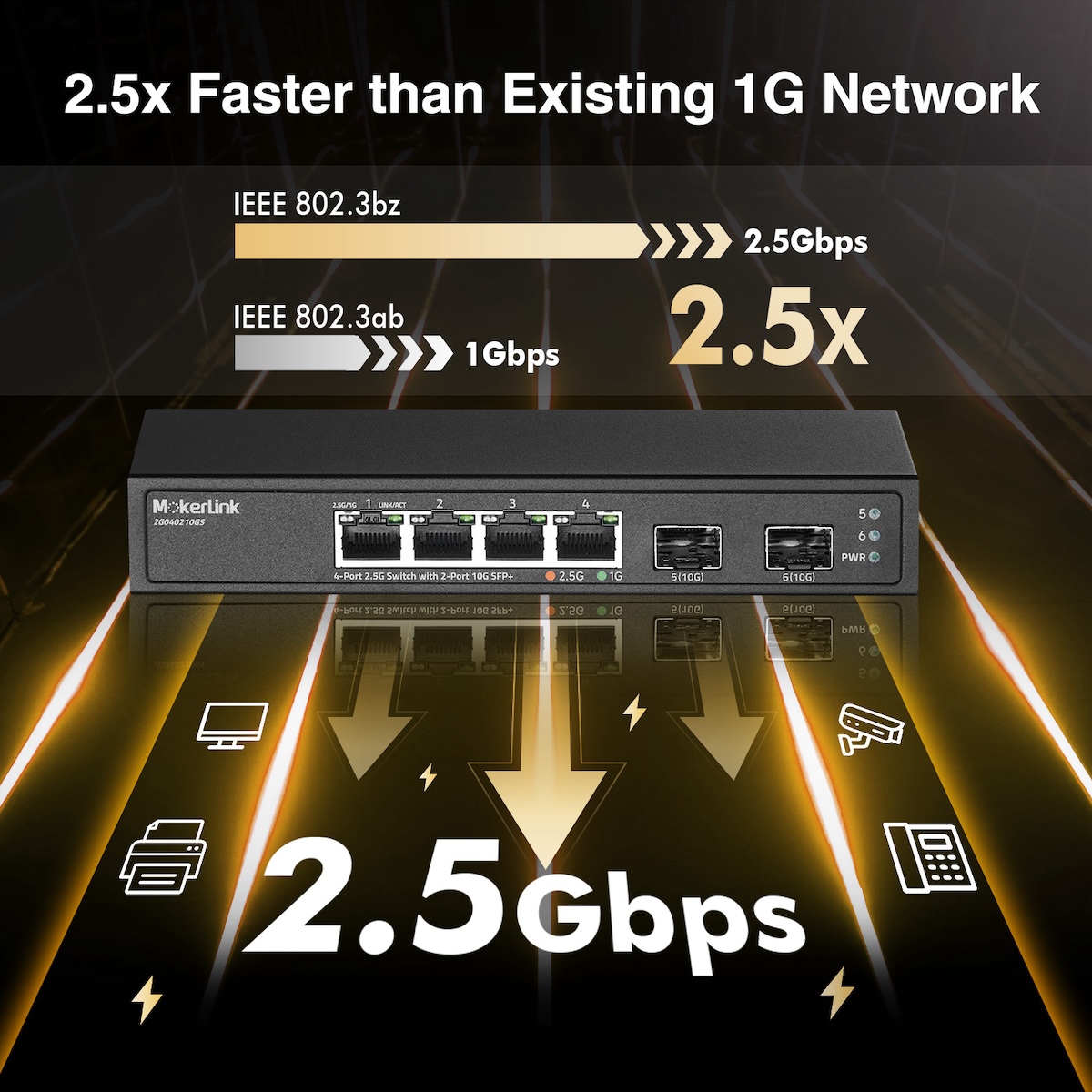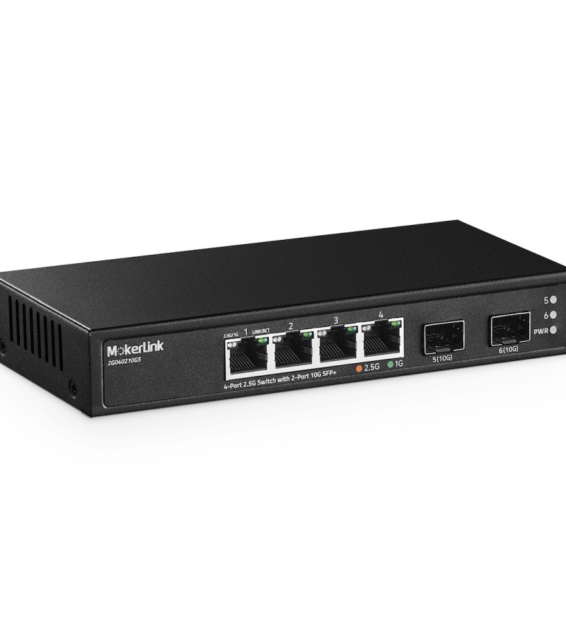Cuatro puertos Ethernet 2.5g, que cumplen con el estándar IEEE 802.3bz (2.5g), admiten adaptación 10 / 100 / 1000m / 2.5g. Puerto SFP 2 x 10g (compatible con módulos 1G / 2.5g / 10g, ancho de banda de tablero trasero de 60 gbps, Plug and Play sin gestión, carcasa metálica, sin ventilador, mini tamaño pequeño, diseño de escritorio / pared, muy adecuado para varios entornos