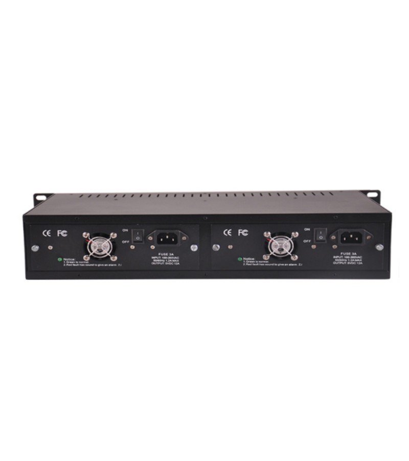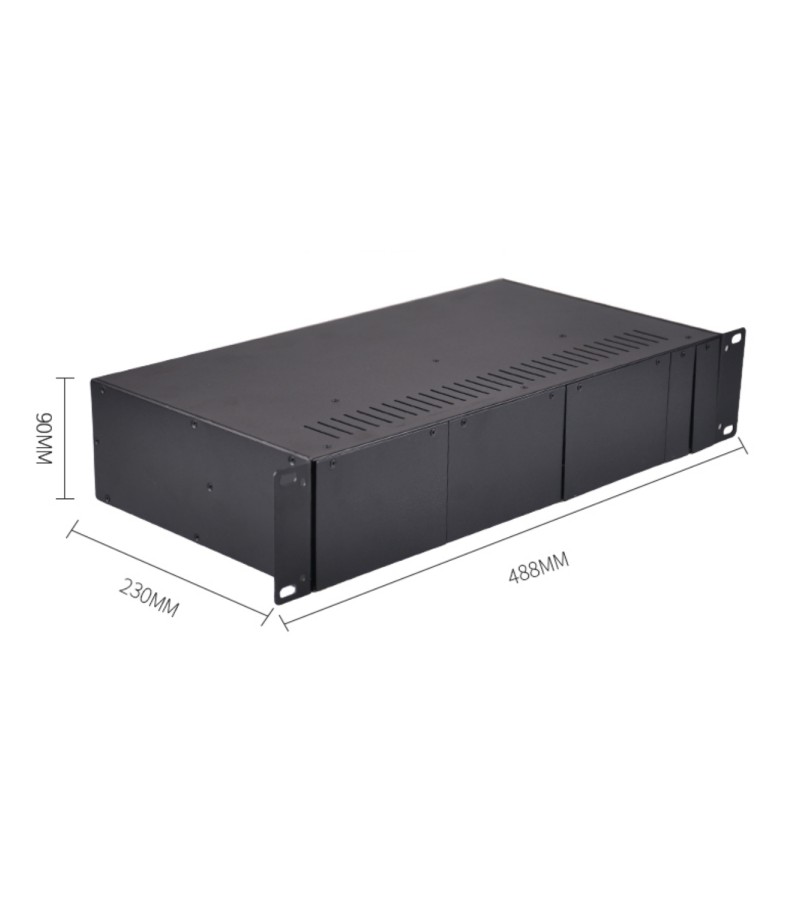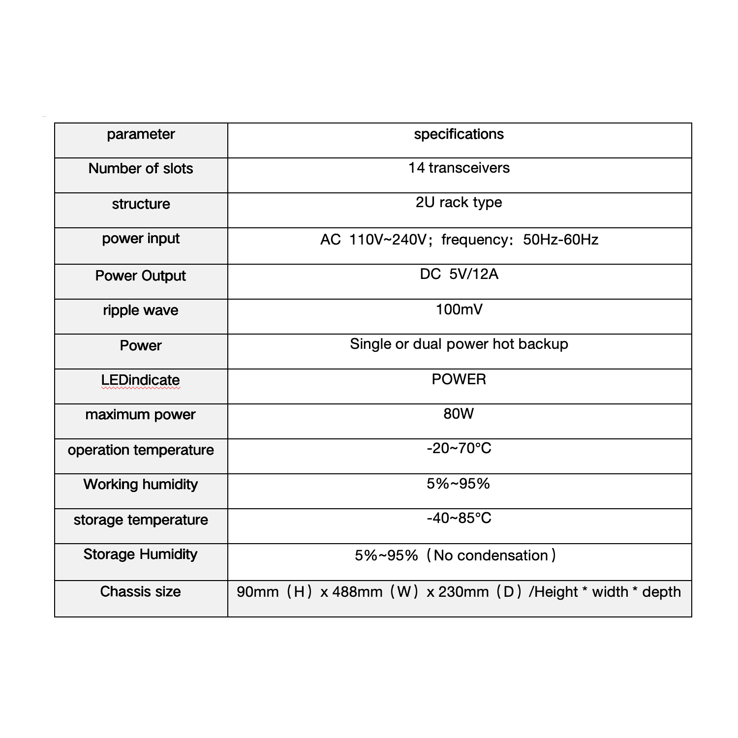 The fiber optic transceiver bracket integrates 14 transceivers into one, which is compact, beautiful, and easy to install. This series of products features a dual power and dual switch design, with the main and backup power configurations ensuring uninterrupted operation of the system. It has a hot swappable function, ensuring safe and stable use. It is equipped with two high-performance fans to improve the ventilation and heat dissipation of the bracket.