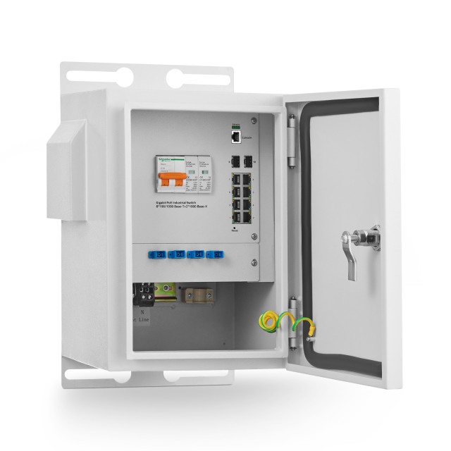 BOX-G082GSPM is an indoor/outdoor PoE+ switch cabinet that integrates a 10-port industrial managed switch, optical fiber tray, power supply, surge protector, air breaker, and smart fan—all housed in a single secure enclosure. Featuring a wide operating temperature range, high protection rating, and advanced technologies, it delivers superior industrial-grade performance with resistance to extreme temperatures and lightning, enhancing the reliability and safety of industrial networks. This makes it well-suited for deployment in harsh environments such as rail transit, safe cities, intelligent transportation, and outdoor monitoring.