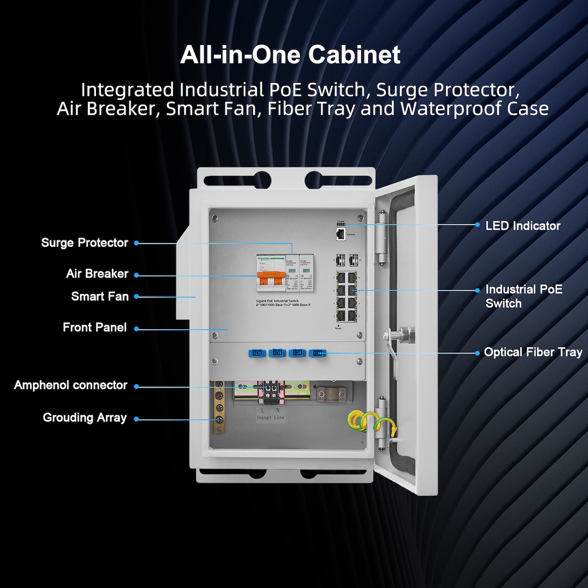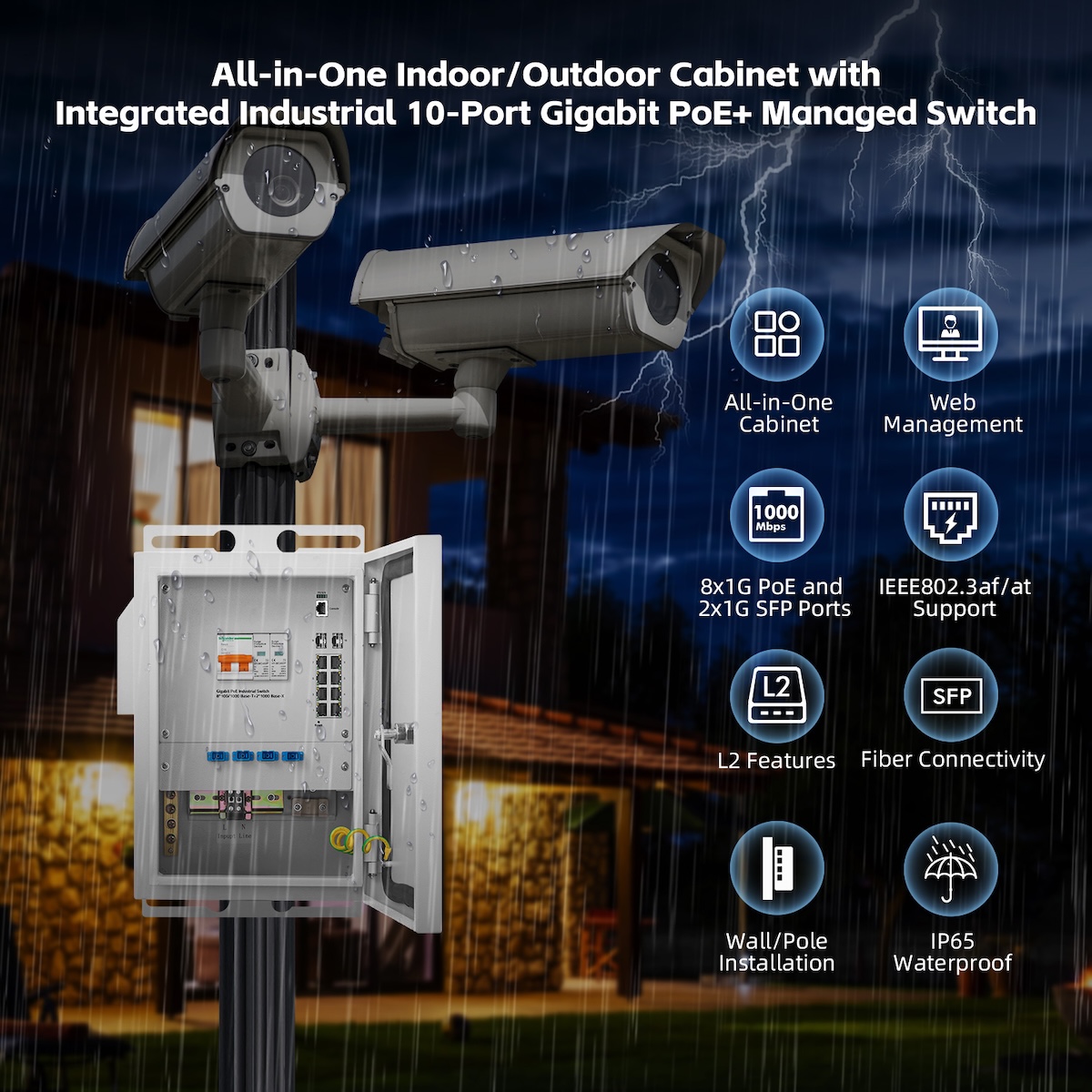 | Product Name | All-in-One Indoor/Outdoor Cabinet with Integrated Industrial 10-Port PoE+ Managed Switch |