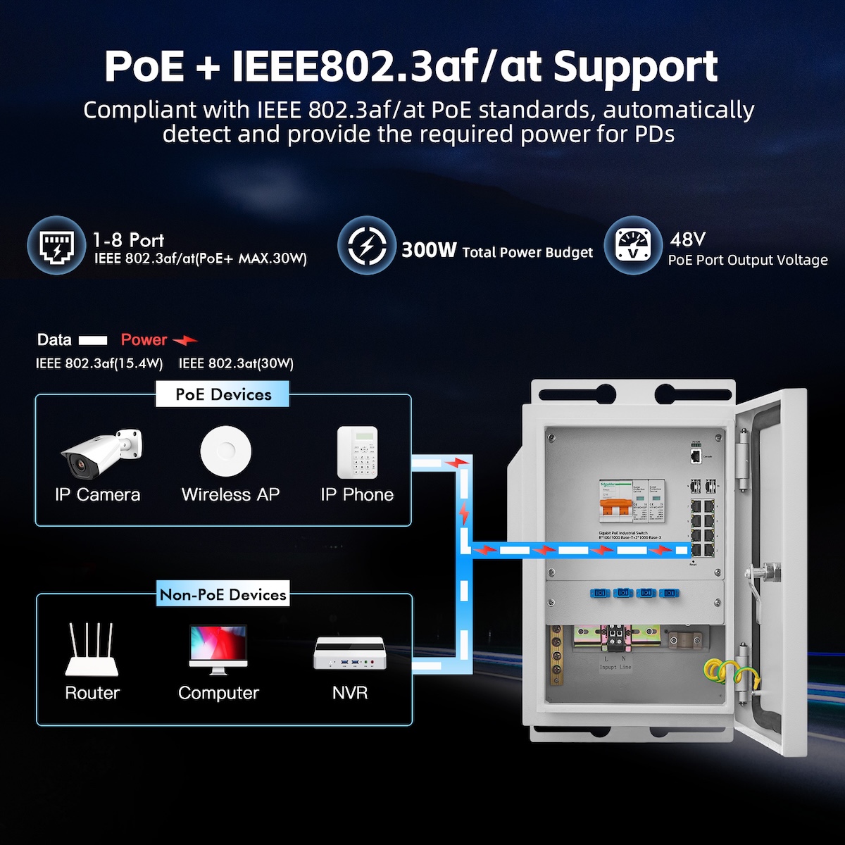 - 300W High PoE Power: Ports 1-8 comply with IEEE 802.3af/at PoE standards, with Per port up to 30W. Includes a 300W internal power supply. Note: Does not support power supply to passive 24V PoE devices, but is fully compatible with non-PoE devices.