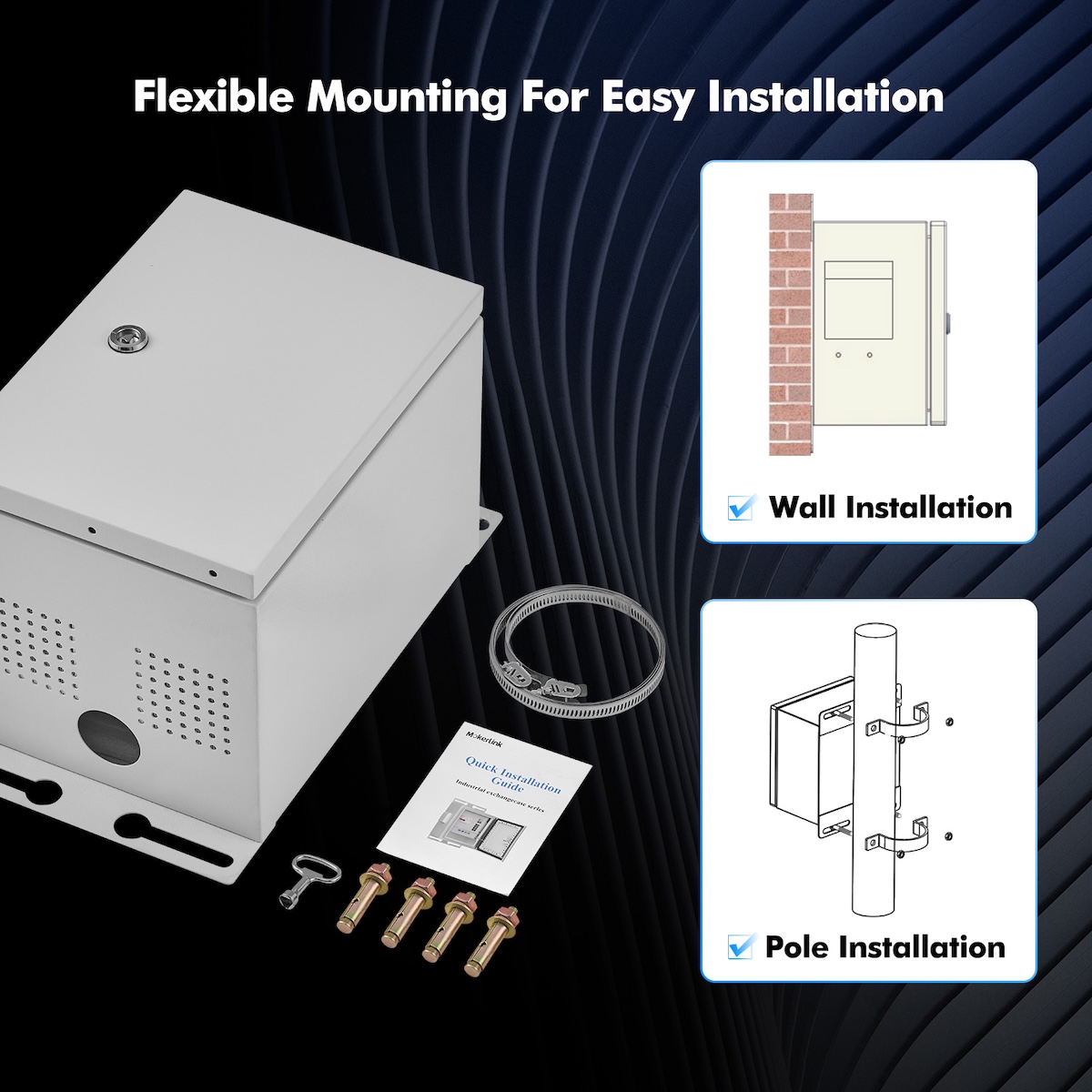 - NEMA-Rated Indoor/Outdoor Design: Ideal for non-ventilated and harsh environments, with a wide operating temperature range of -40°C to 70°C (-40°F to 158°F) and a built-in fan for efficient heat dissipation. Constructed from high-quality 1.2mm galvanized sheet, it features a triangle lock, IP55 weather resistance, anti-corrosion, and anti-vandal properties. Supports both pole and wall mounting.