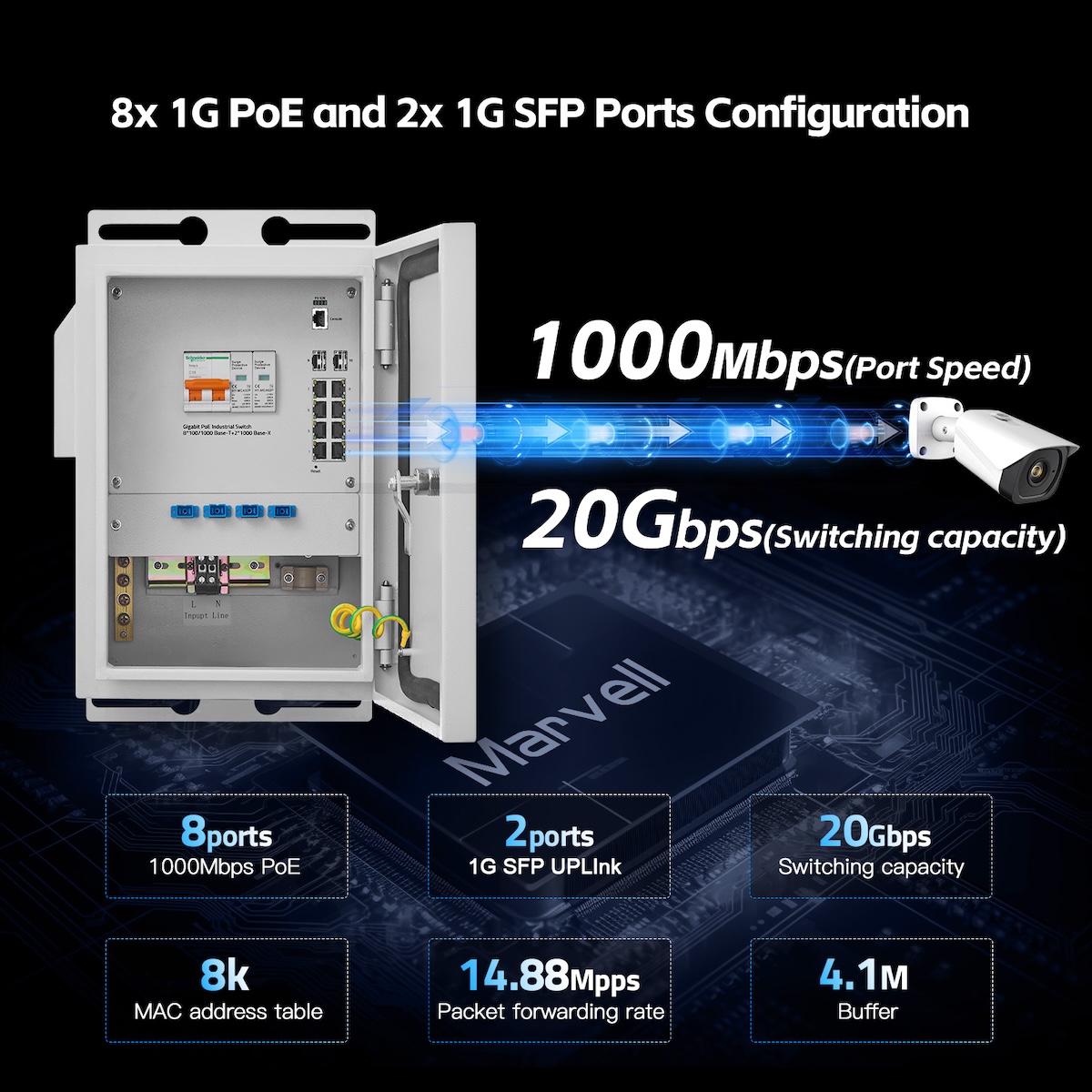 - 8 Gigabit Ports: Equipped with 8 Gigabit PoE+ Ethernet ports (supporting 10/100/1000Mbps) and 2 1G SFP slots. The SFP slots support single-mode/multi-mode optical modules for extended-distance transmission. With a switching capacity of 20Gbps, each PoE port can simultaneously deliver 1Gbps speeds for high-speed data transmission.