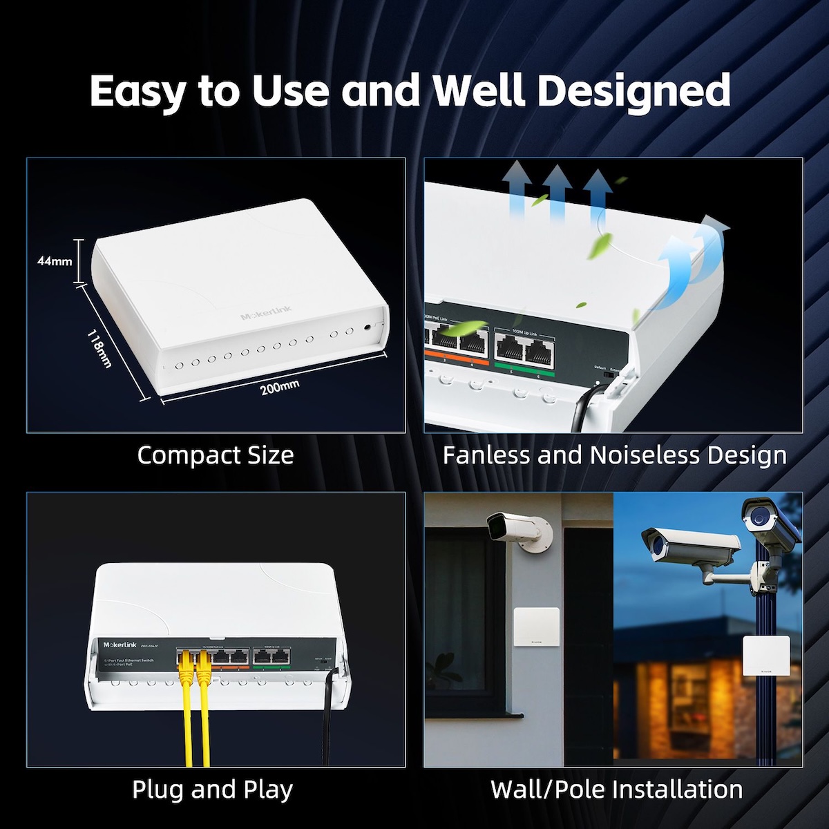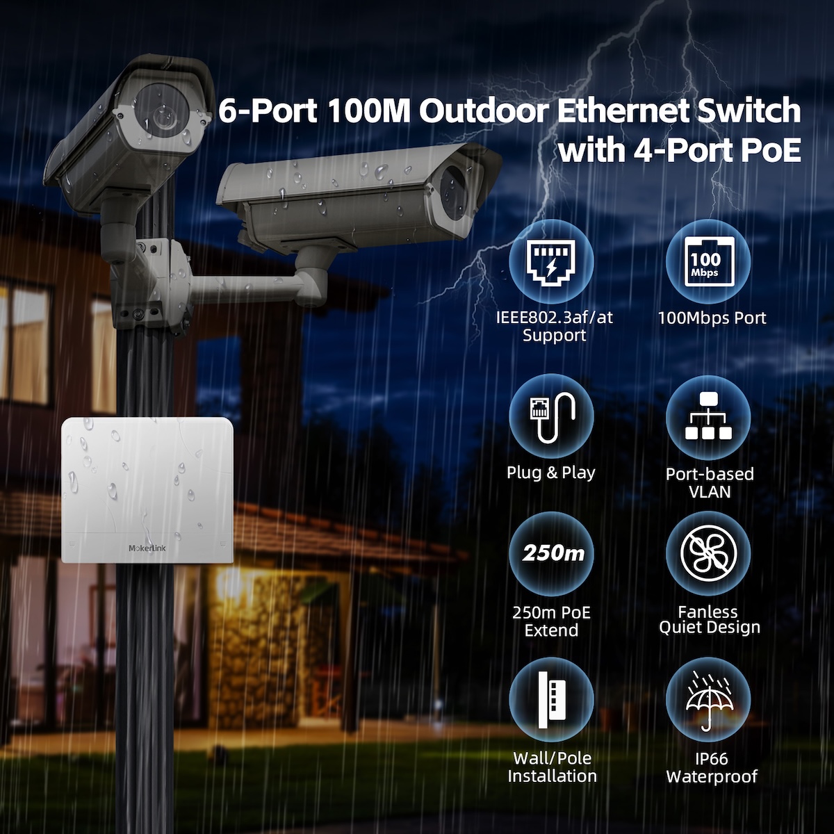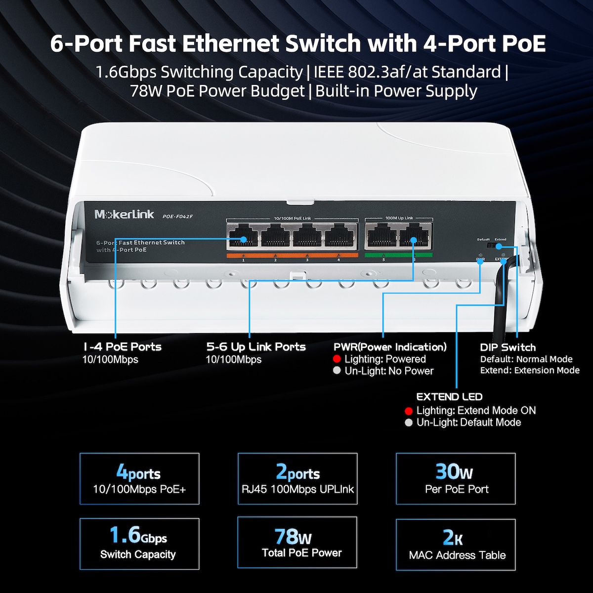 MokerLink 6 Port Outdoor POE Switch, 4 POE+ Ports, 2 UpLink, 10/100Mbps, 78W IEEE802.3af/at, Weatherproof Unmanaged Plug and Play Fanless Switch