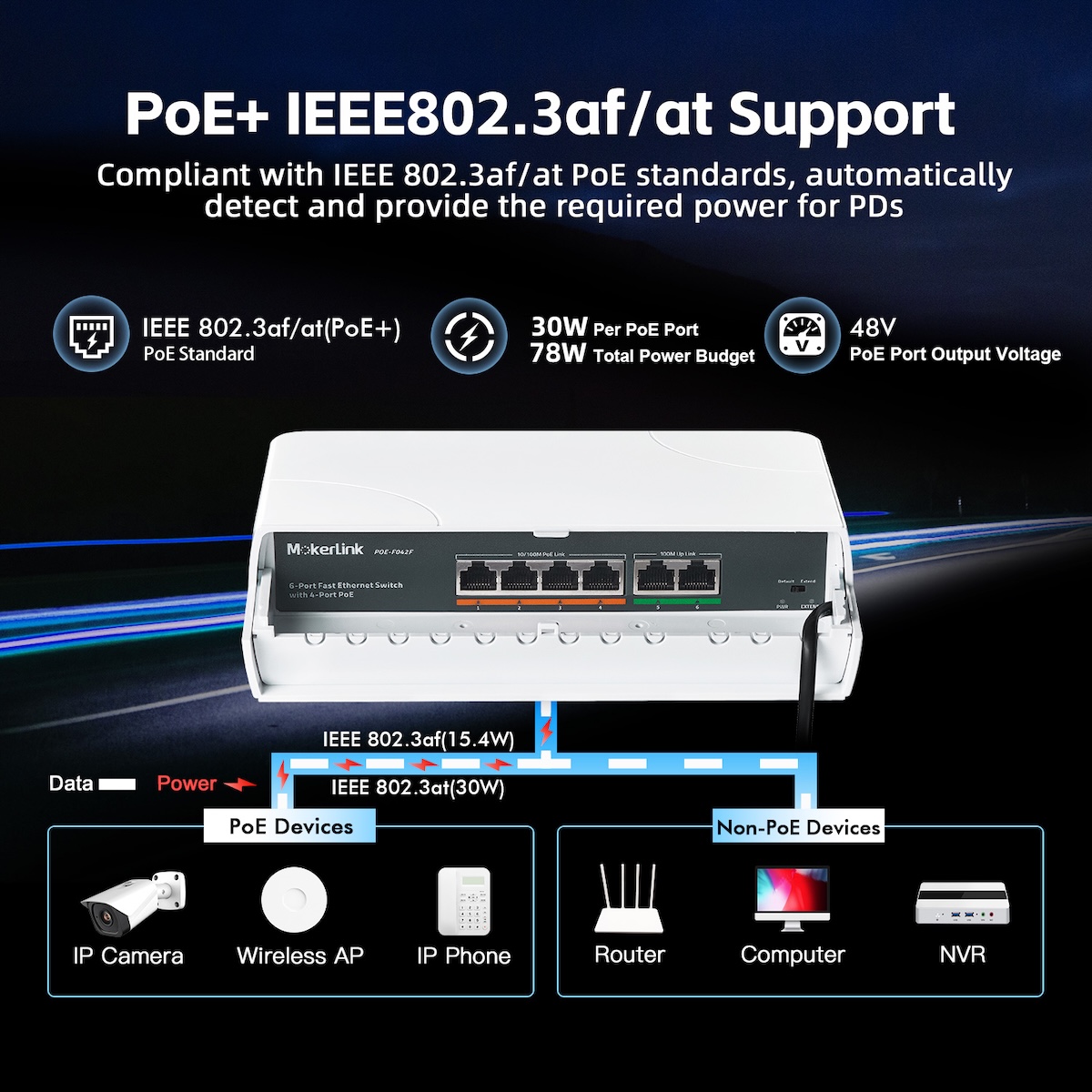 Equipped with 4 x 100M RJ45 PoE ports and 2 x 100M RJ45 uplink port, each PoE port provides a maximum power supply of 30W, with a total power output of 78W. The switch can automatically detect and identify PD devices compliant with IEEE 802.3af/at standards, and supports priority scheduling.