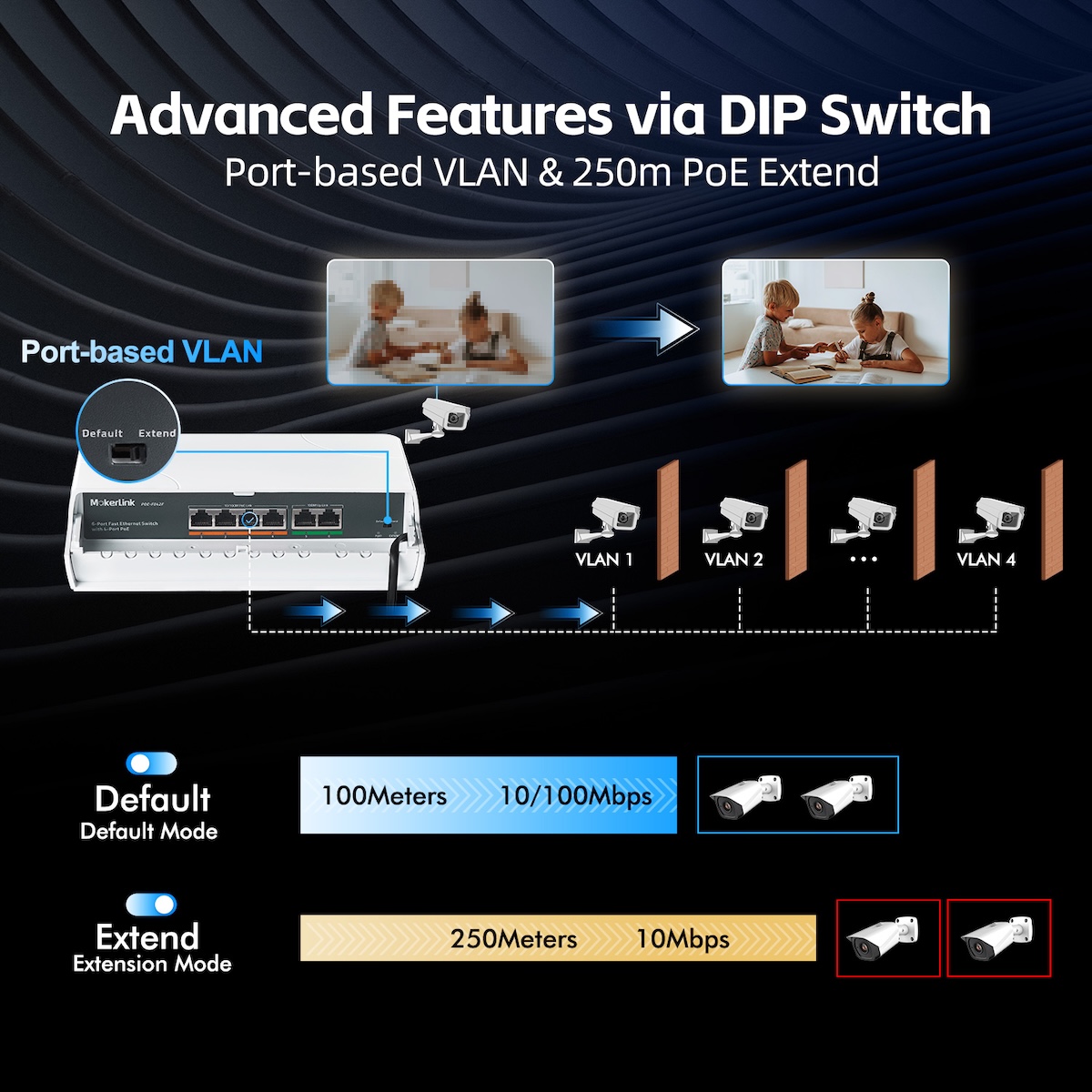 - Features 4 x 10/100 Mbps auto-adaptive RJ45 PoE ports, enabling high-speed forwarding and lossless data transmission