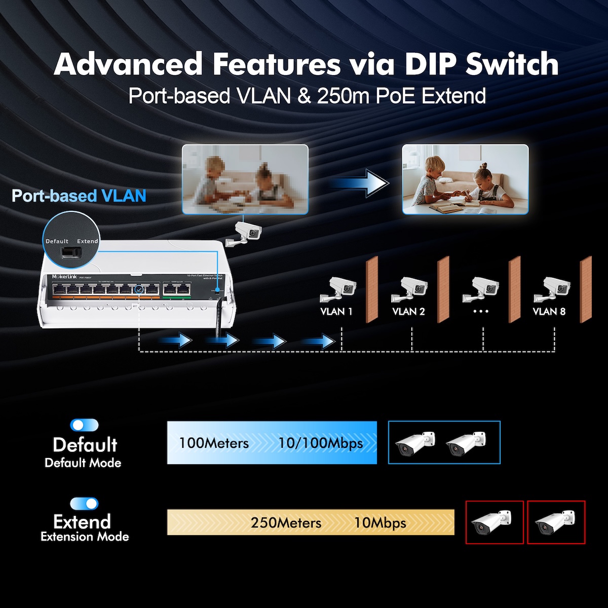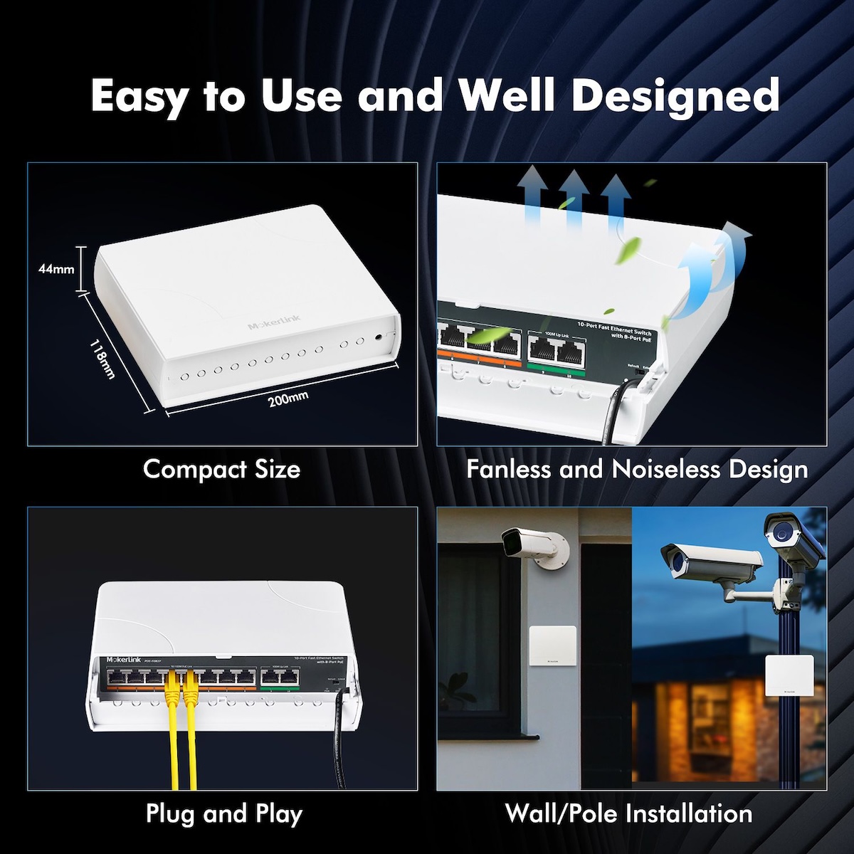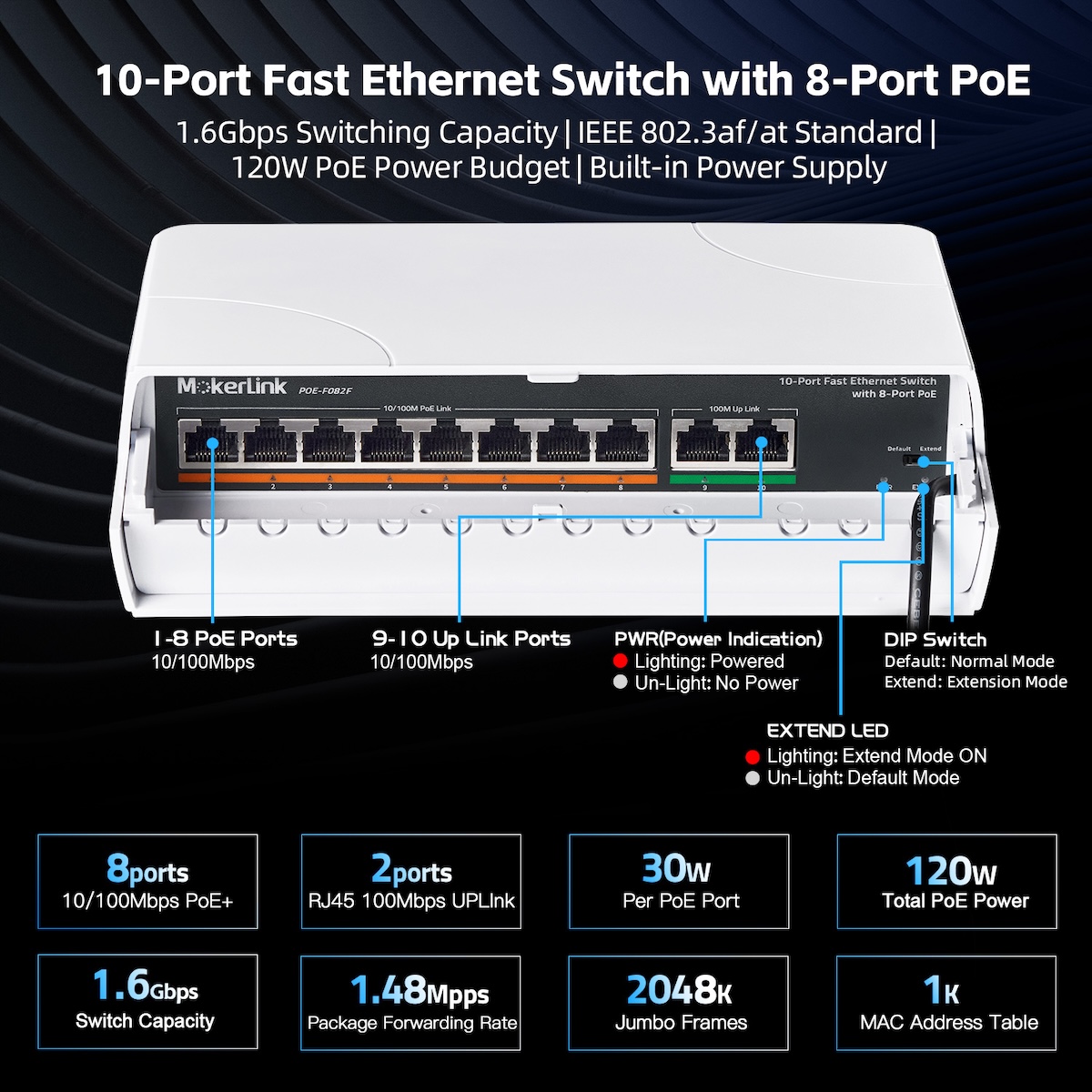 - Features 8 x 10/100 Mbps auto-adaptive RJ45 PoE ports, enabling high-speed forwarding and lossless data transmission
