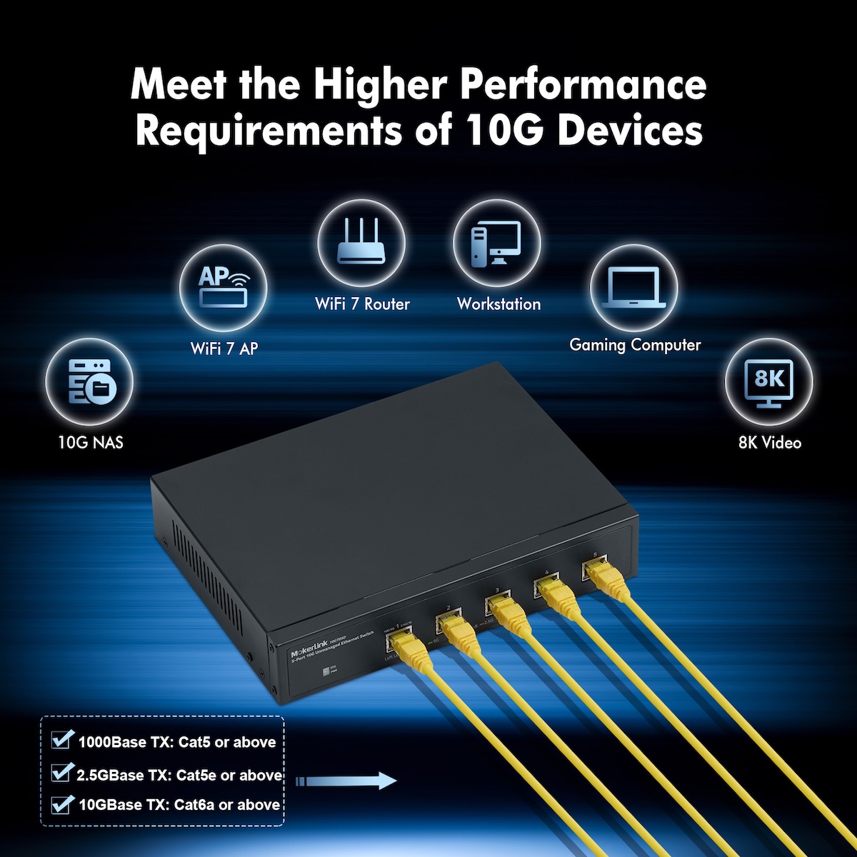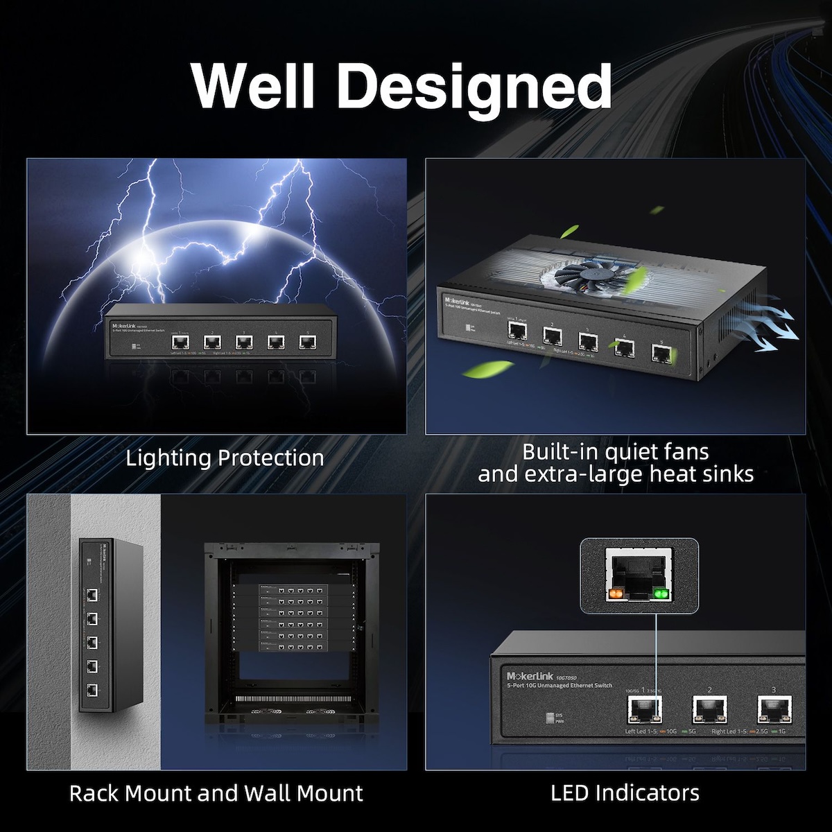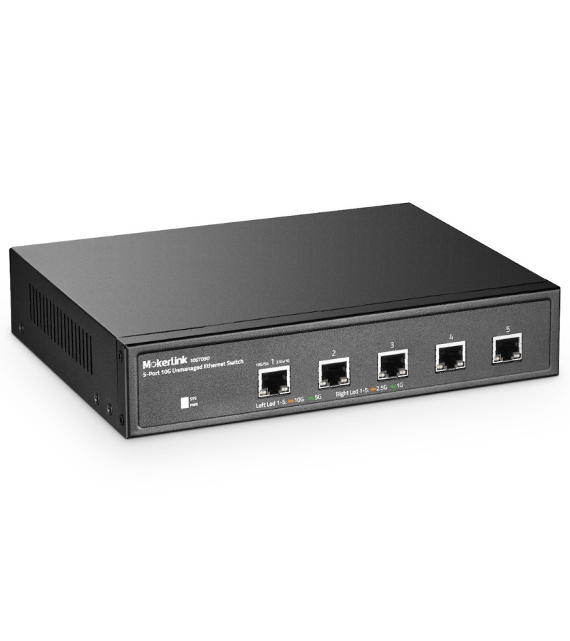 MokerLink 5 Port 10G Unmanaged Ethernet Switch, 10G/5G/2.5G/1G Auto-Adaptive, Plug and Play, Metal Desktop|Rackmount Network Switch