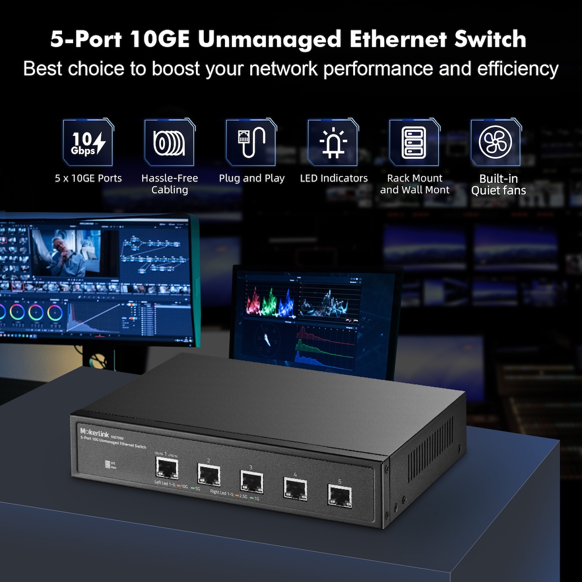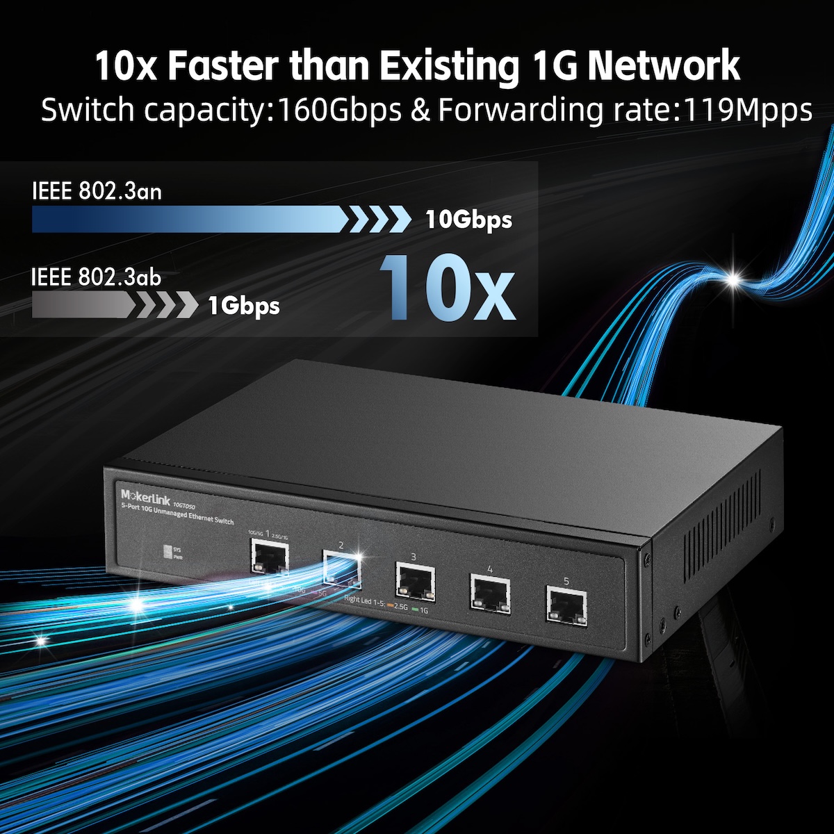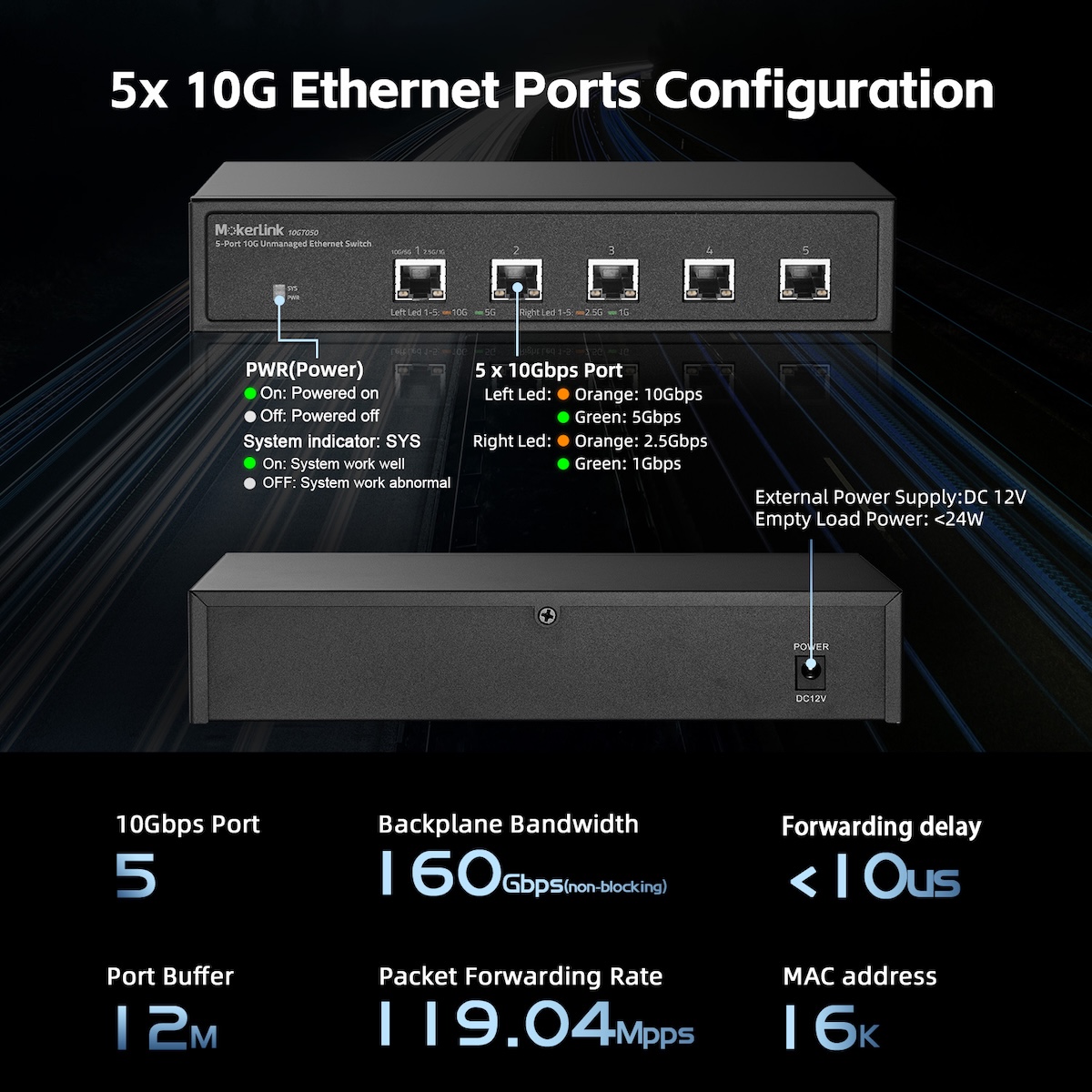 5 x 10Gbps ethernet ports, every port support auto-adaptive 10G/5G/2.5G/1000M/100M data rate, Unmanaged Plug and Play 160Gbps Bandwidth: switching capacity is 160Gbps, Jumbo Frame 16Kbytes, all ports can achieve non-blocking 10G line speed forwarding, with excellent data performance.Easy to Maintain with power and port led indicator light, clearly display the running status and port rate status, installation and maintenance are very simple, Widely Used for various high performance environments