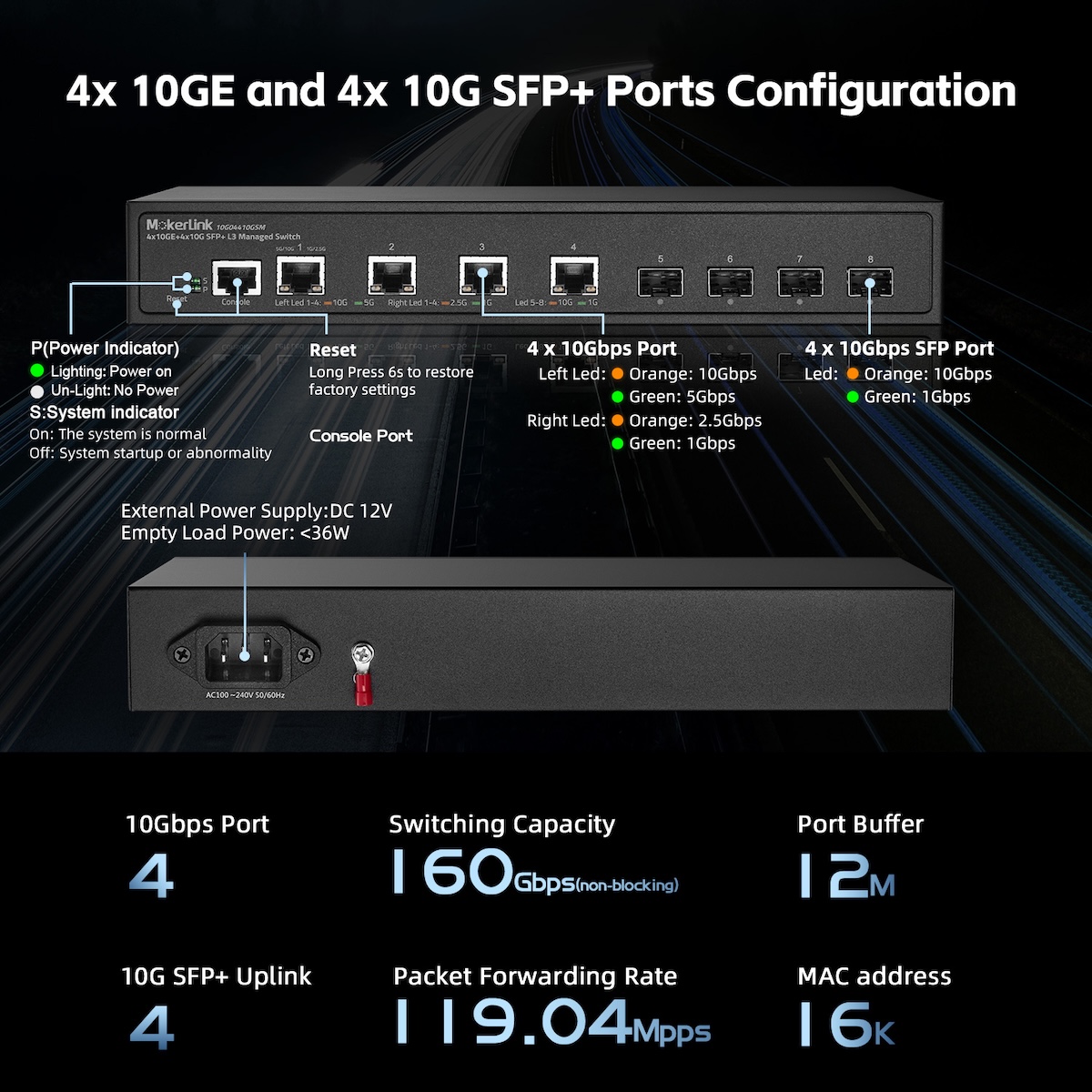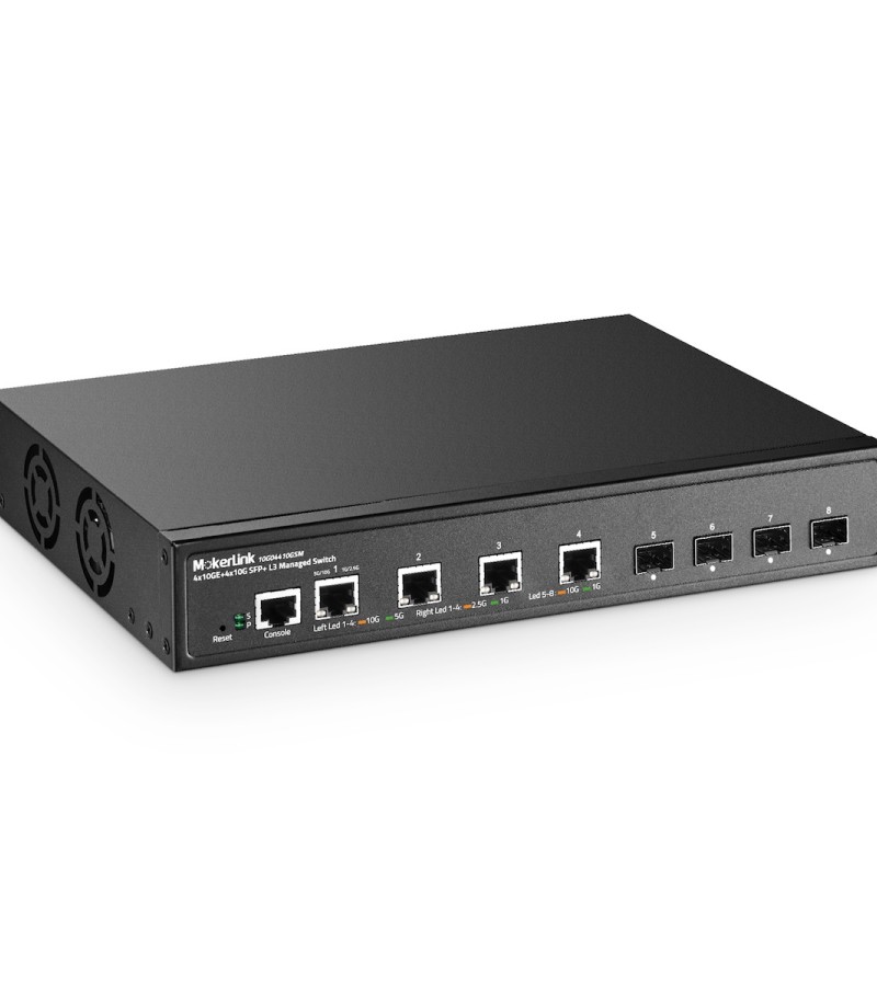 This switch is equipped with 4x 10G auto-adaptive Ethernet ports (compatible with 10G/5G/2.5G/1000M/100M) and 4x 10G SFP+ optical slots (supporting 1G/10G optical modules for long-distance fiber transmission). Boasting 160Gbps switching capacity, 119.04Mpps packet forwarding rate and a 16K MAC address table, it supports full-duplex flow control to achieve non-blocking 10G wire-speed forwarding. It features Layer 3 management via Web/CLI, covering IPv4/IPv6 routing, VLAN, ACL and other functions, along with