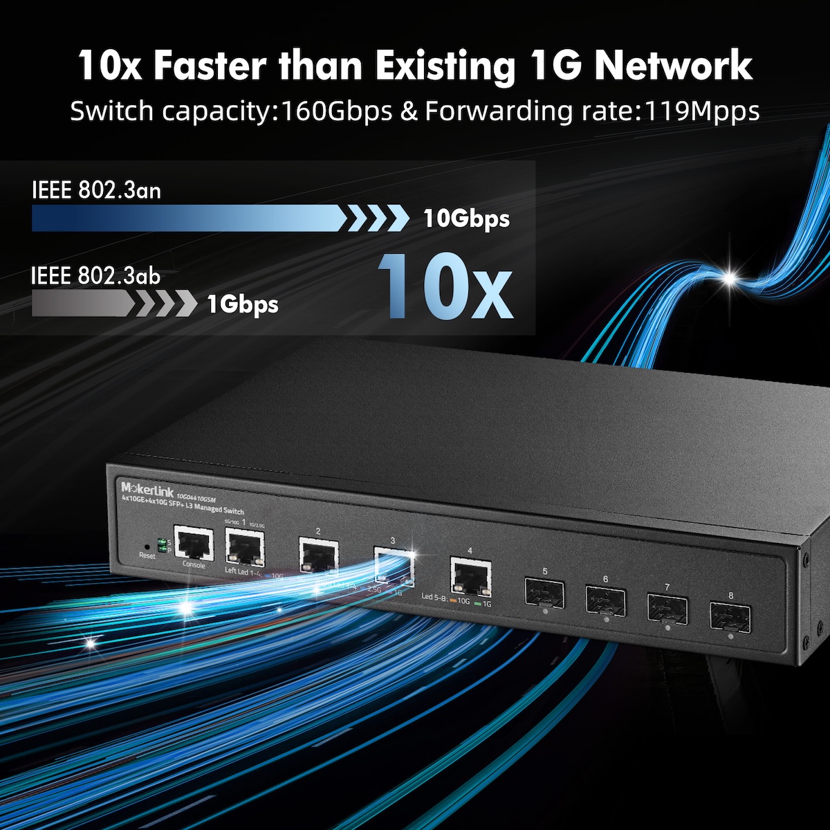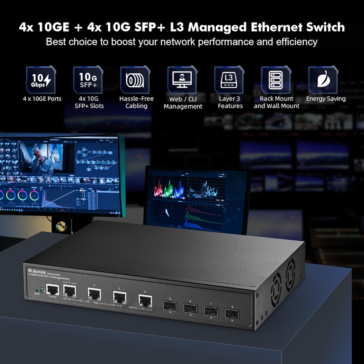 MokerLink 8 Port 10G Managed Switch, 4x10G Ethernet RJ45 Ports, 4x10G SFP+ Slot, L3 Web/CLI Managed, Metal Desktop|Wallmount Network Switch