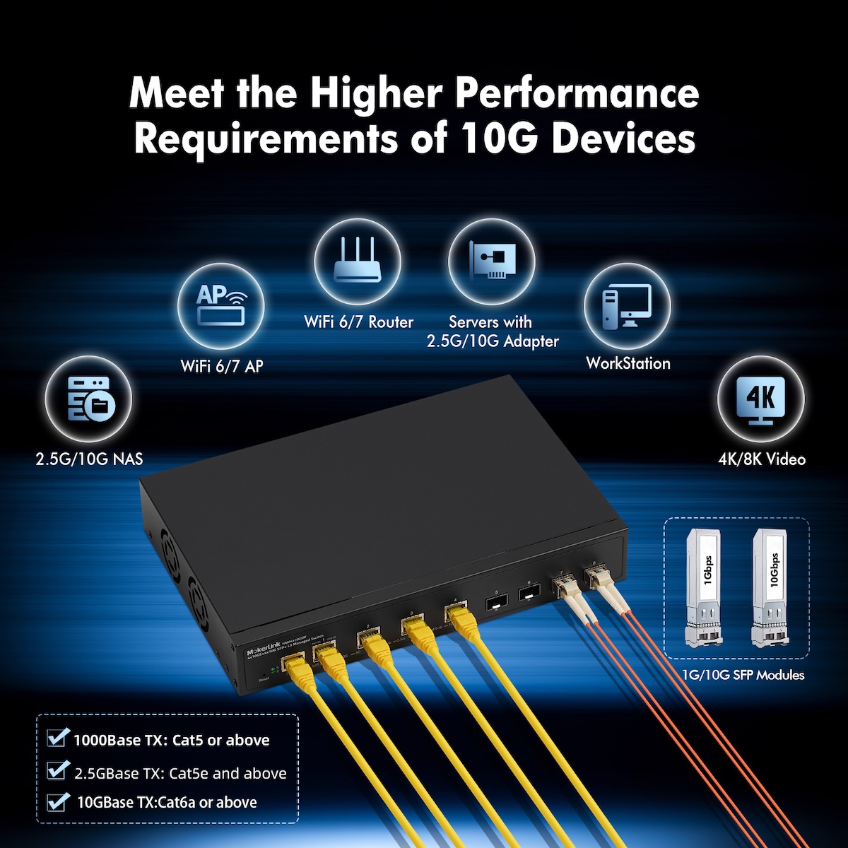 - 4*100M/1G/2.5G/5G/10Gbps RJ45 Ports and 4*1G/2.5G/10Gbps SFP+ slots;