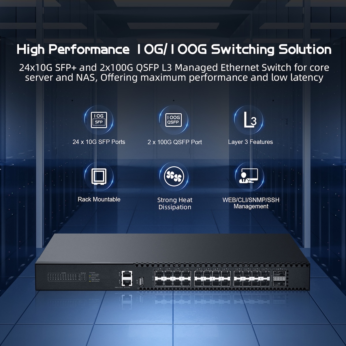 | Product Name | 24x10G SFP+ and 2x100G QSFP L3 Managed Ethernet Switch |