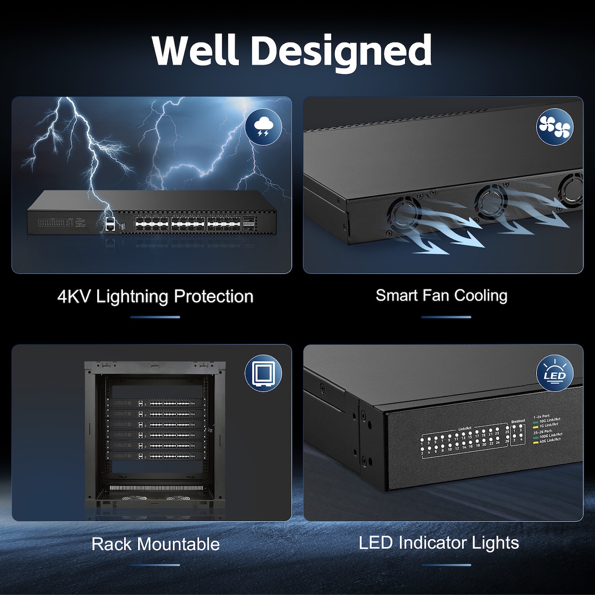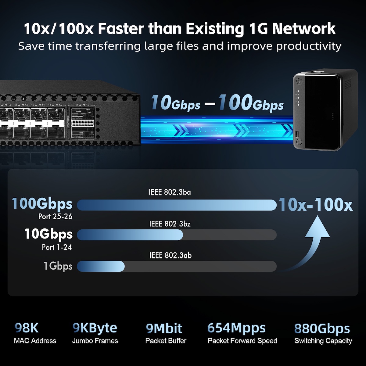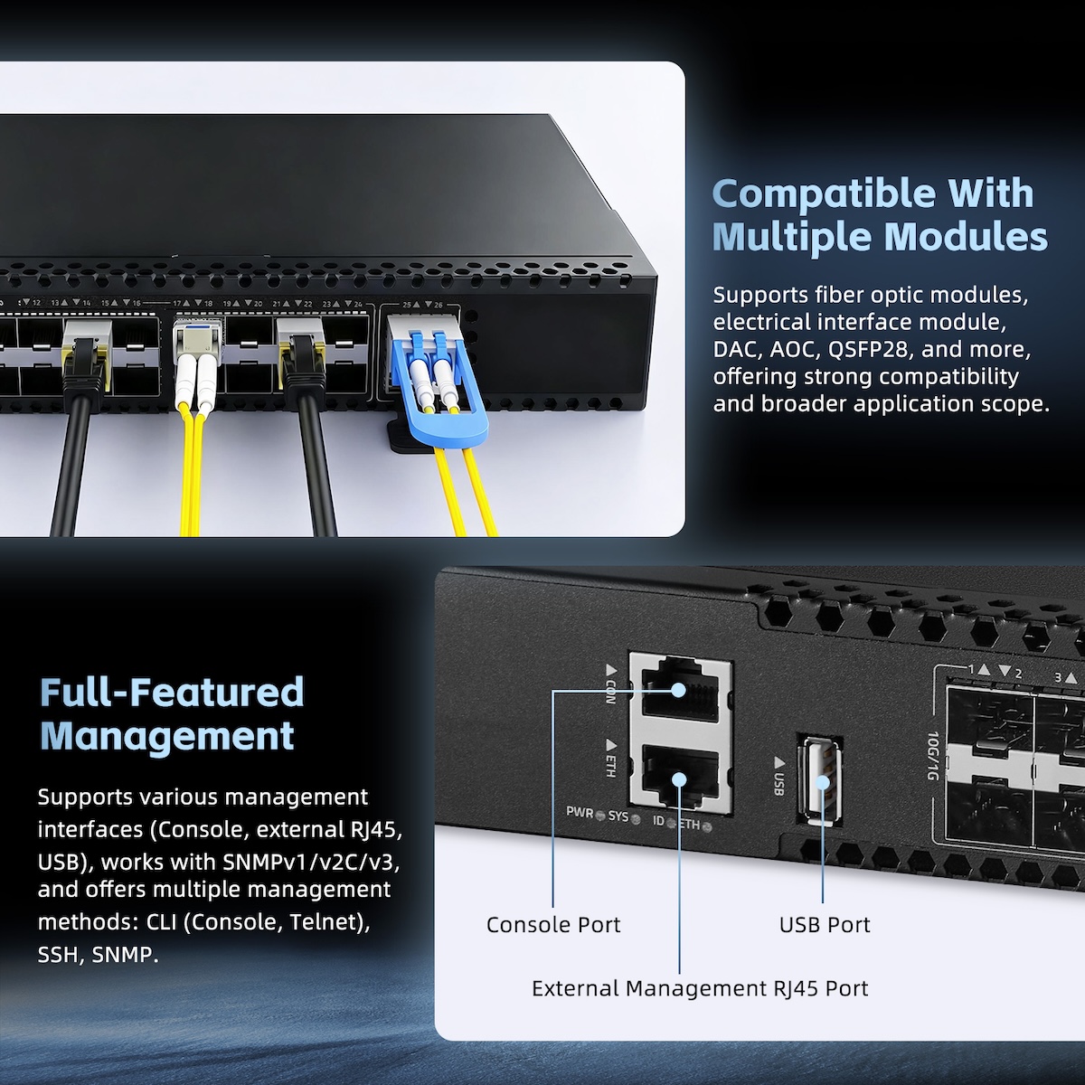 - Support 24*10Gbps SFP+ Ports and 2*100Gbps QSFP28 ports
