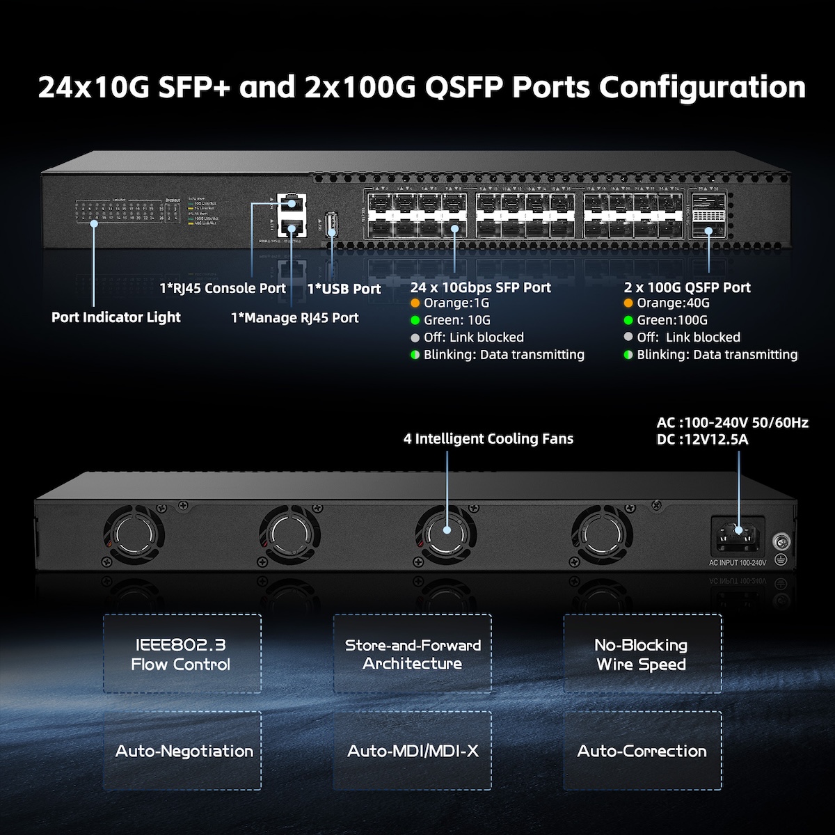 | Ethernet Port | 24*10Gbps SFP+ ports, 2*100Gbps QSFP28 ports, 1*Console port, 1*ETH port 1*USB port |