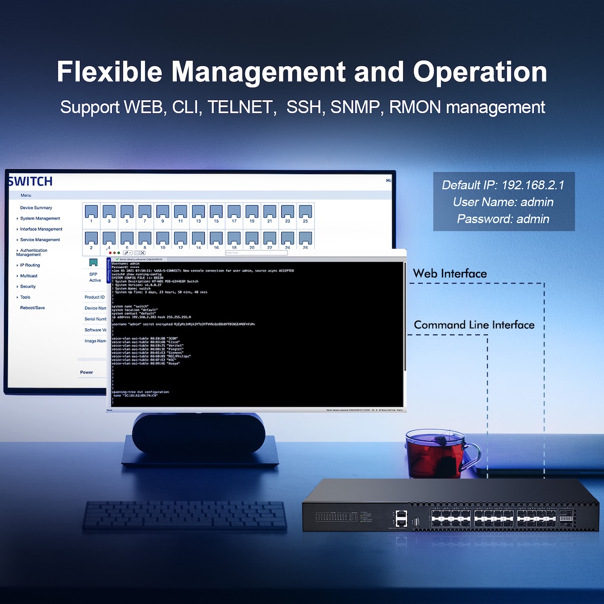 The 10G242100GSM is a high-performance Layer 3 Ethernet switch featuring 24 x 1G/10GbE SFP+ ports and 2 x 40G/100 GbE QSFP28 ports, all integrated into a compact 1U form factor. Equipped with full-featured system software, comprehensive protocols, and rich application support, it enables rapid service deployment and simplified management for both traditional Layer 2 and Layer 3 networks. Specifically engineered to handle demanding workloads, this switch supports advanced capabilities including MLAG, ETH OAM