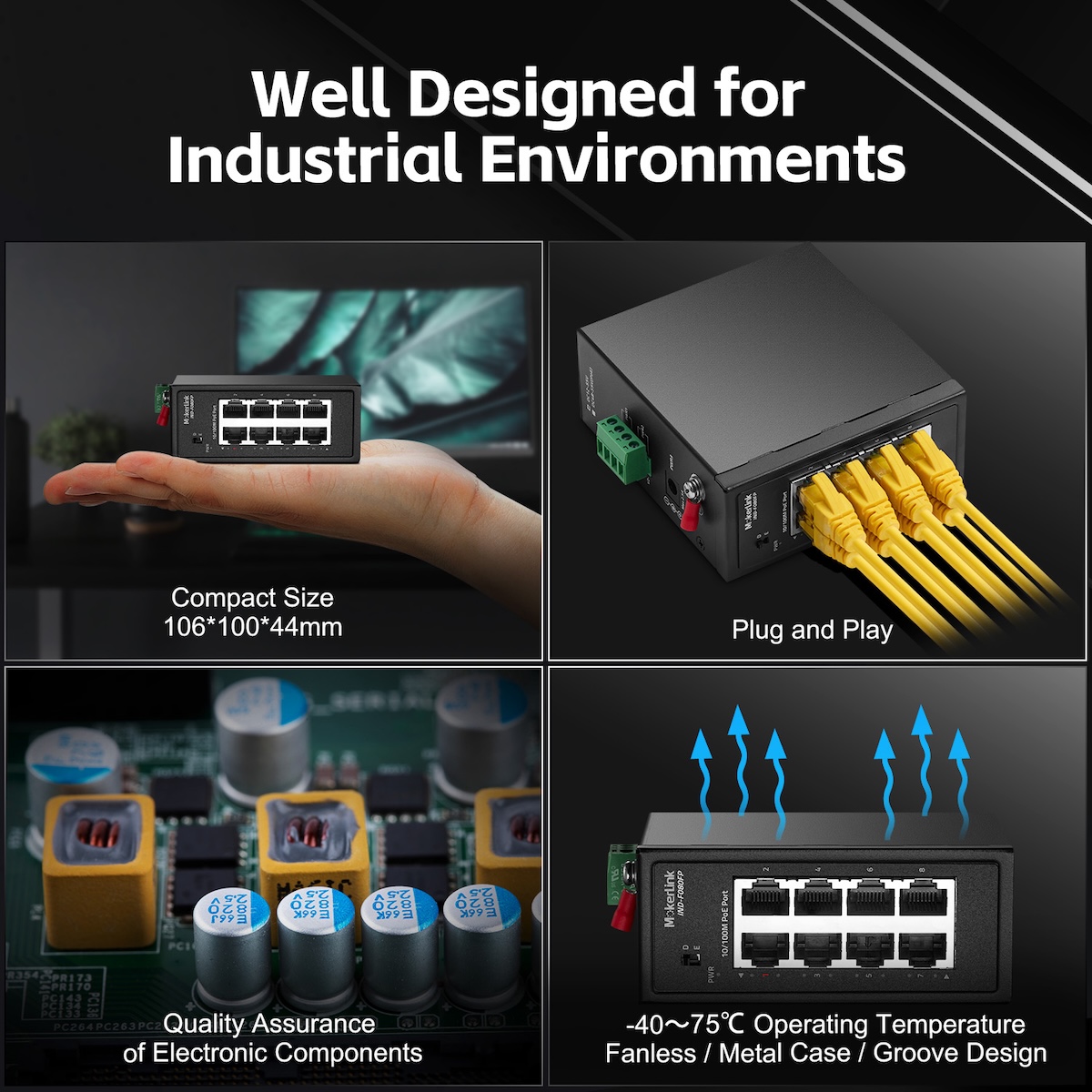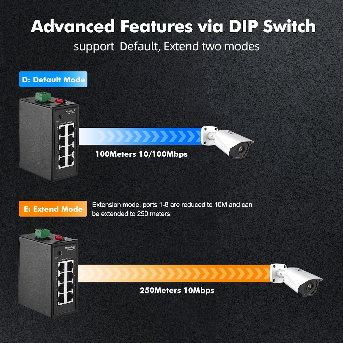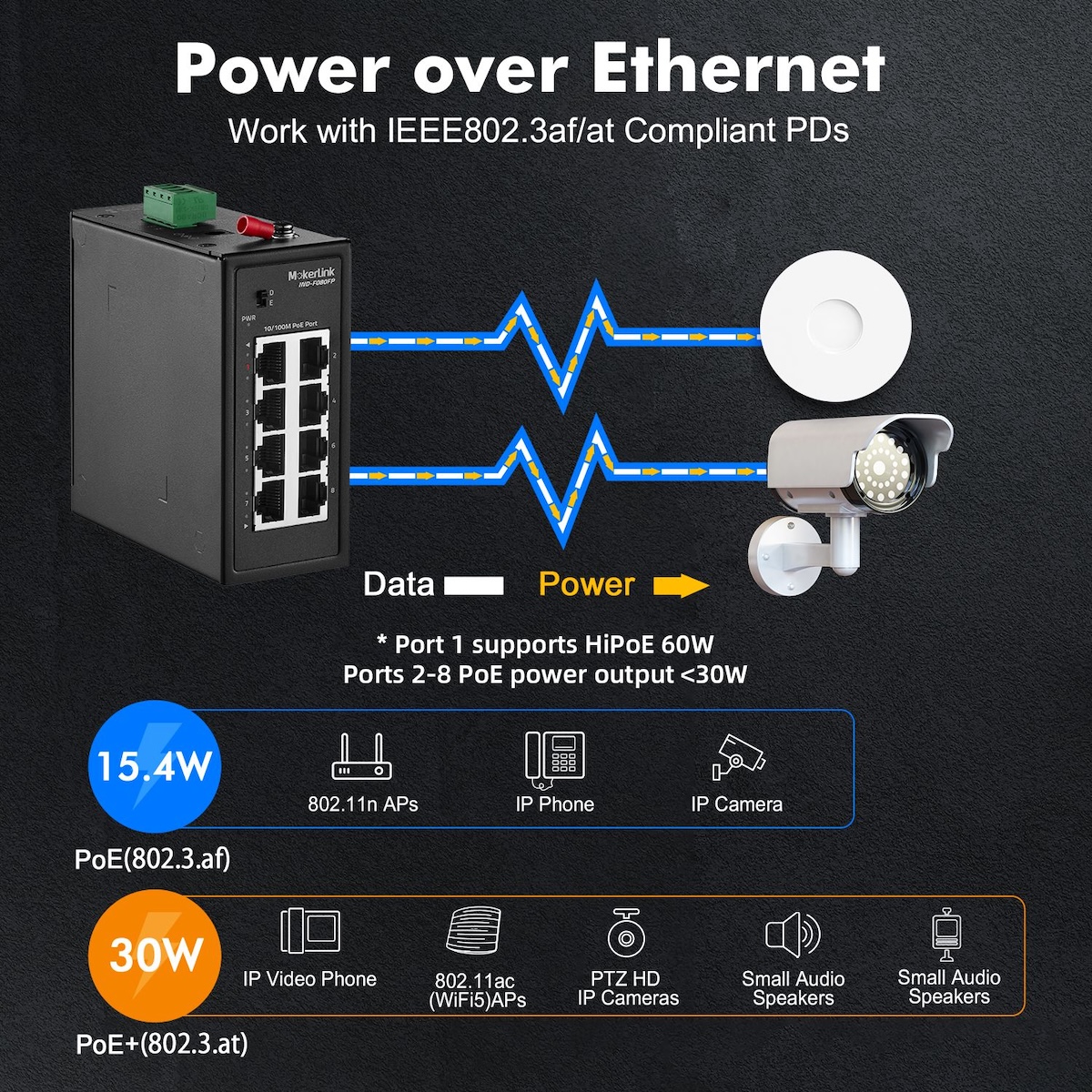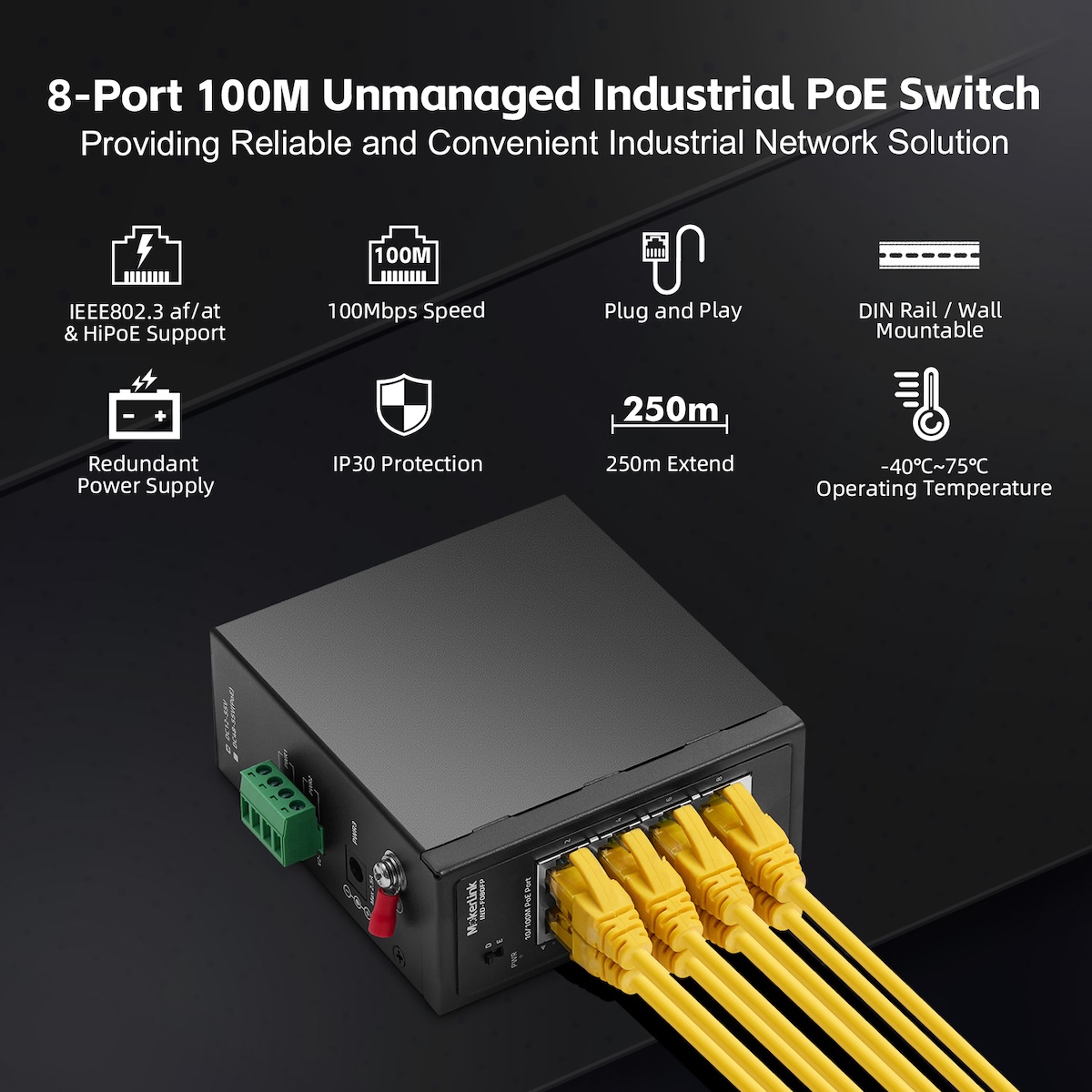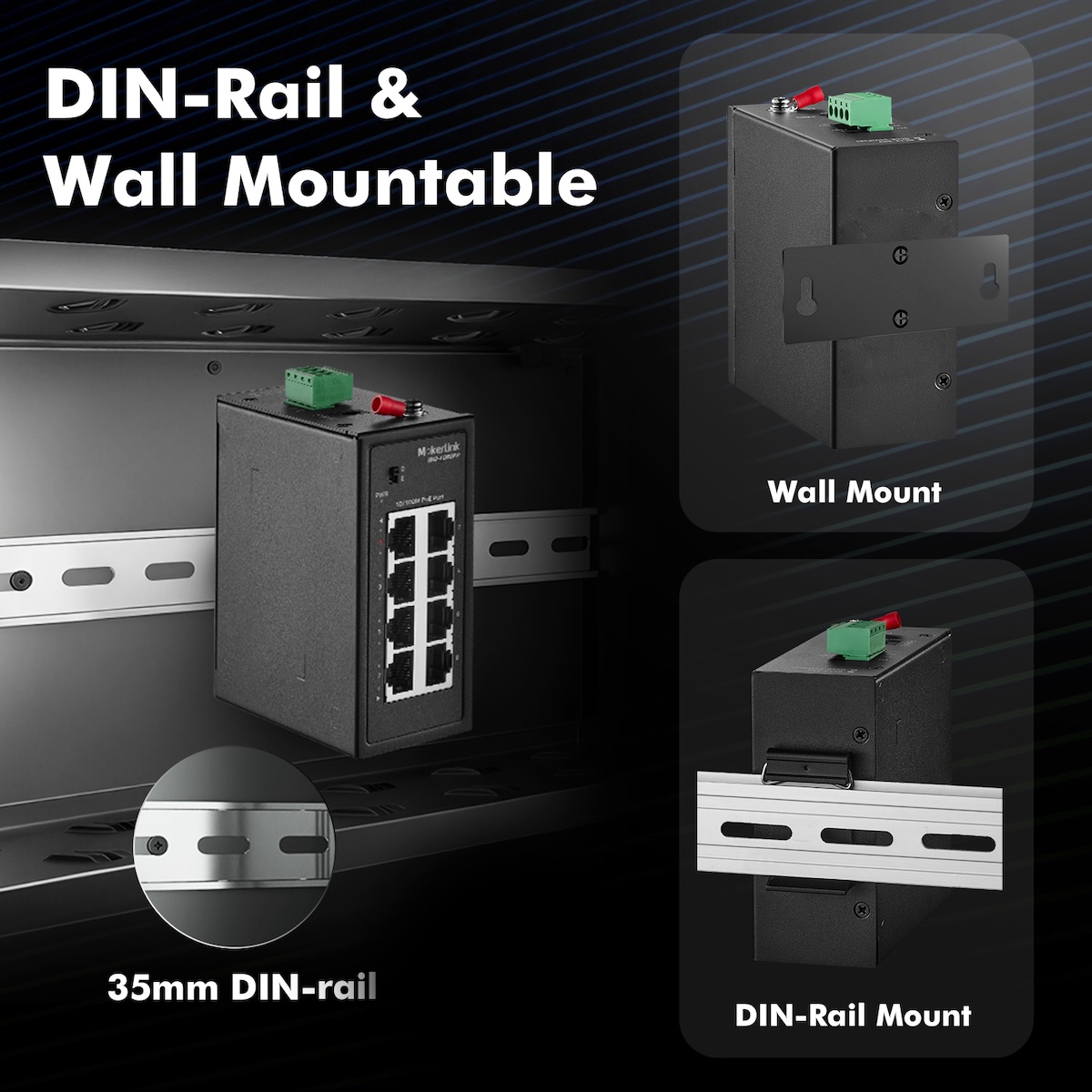 MokerLink 8 Port PoE Industrial Din Rail Switch, 8 PoE+ IEEE802.3af/at, 10/100Mbps Fast Ethernet, Extend 250M, DIN-Rail & Wall Mount Included