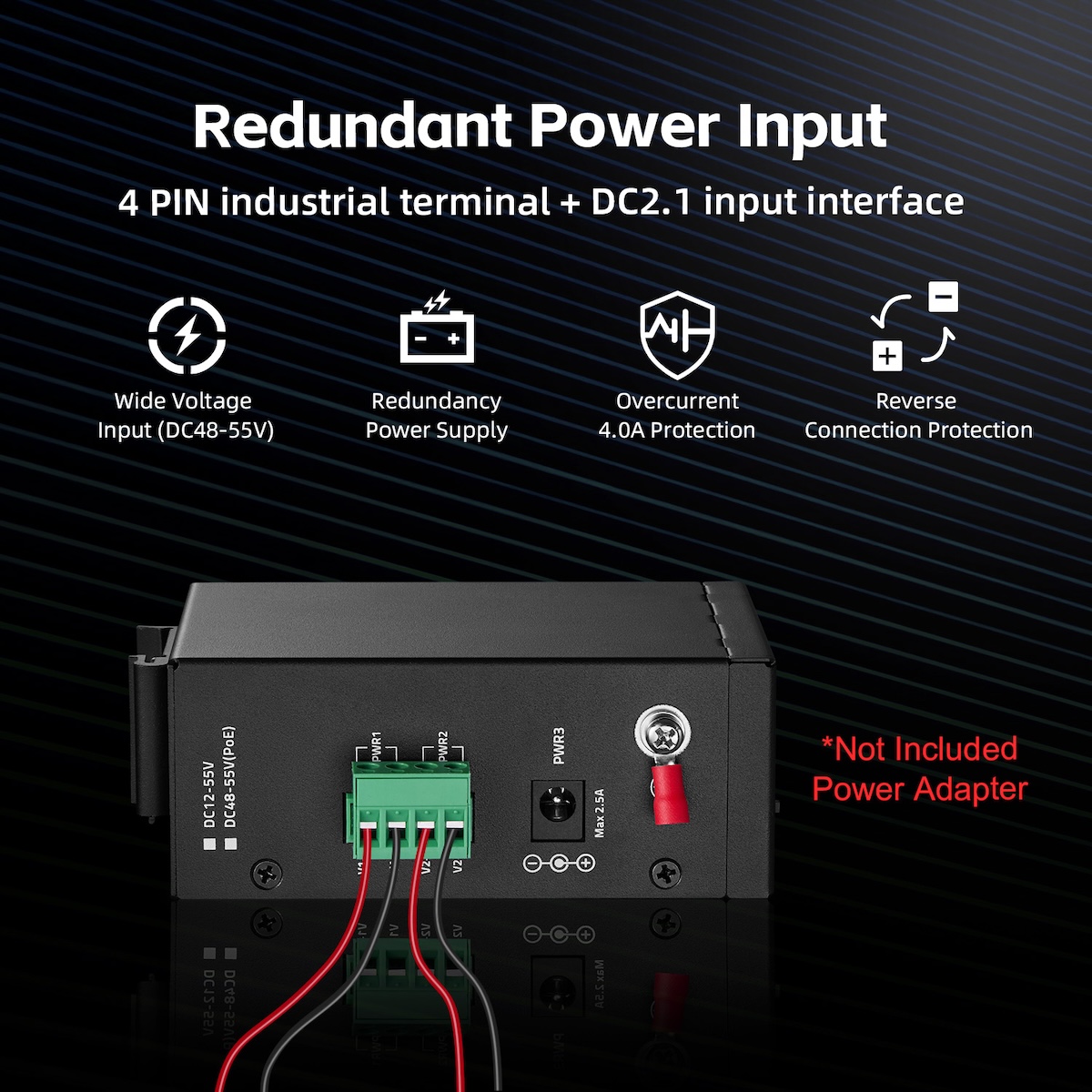| Power Supply | DC48~55V (PoE) Power wiring: 4 PIN industrial terminals (redundant V1+V1-, V2+V2-)/DC 2.1(DC 2.1 cannot be combined with V1, V2 used simultaneously) |